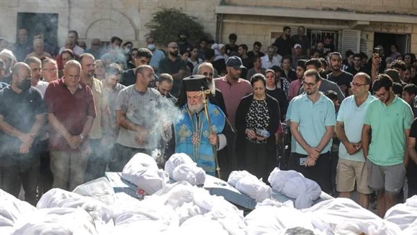 وقرعت الكنيسة أجراس الحزن، قبل أن يترأس المطران أليكسيوس صلاة الجنازة على الجثامين التي سجّيت في باحة الكنيسة، بمعاونة الأب سيلاس حبيب، وبمشاركة الأب يوسف أسعد من كنيسة العائلة المقدسة للاتين، والراهبات، وجمع من المصلين.