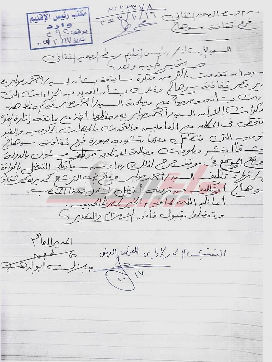 كان آخر هذه المخالفات وليس آخرها التي تحمل العديد من المخالفات، والتي تشهد علي ذلك، حيث تم منذ أيام قيام السيد مدير عام فرع ثقافة سوهاج، بتحرير مذكرة وجهها عبر البريد الإلكتروني يطالب فيها من السيد رئيس إقليم وسط الصعيد الثقافي، بإنهاء عمل السيد مدير قصر ثقافة سوهاج كمدير للقصر، وذلك لوقوع عدد من المخالفات ولحصوله على جزاءات، ولما يسوده القصر من حالة من الفوضى وعدم واقعية النشاط، واستغلال منصبه لمصالح وعلاقات شخصية، على أن يتم تولية مهام مدير القصر لقيادة متحققة ويصلح أن يكون عنوانا للثقافة بمحافظة سوهاج.