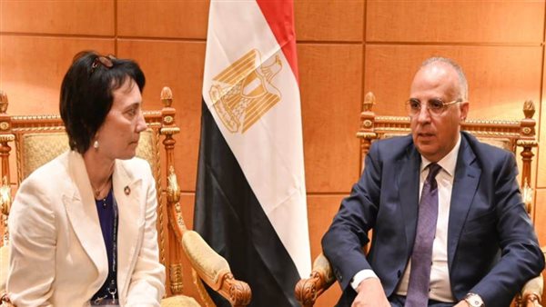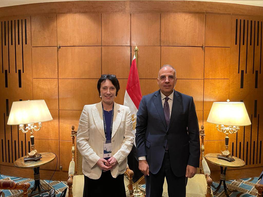 على هامش فعاليات اسبوع القاهرة السادس للمياه التقي الدكتور هانى سويلم وزير الموارد المائية والرى بايلينا مانينكوفا نائب الأمين العام للمنظمة العالمية للأرصاد الجوية.