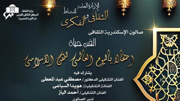 بمناسبة اليوم العالمى للفن الاسلامى تعقد دار الاوبرا المصرية برئاسة الدكتور خالد داغر امسية لصالون اوبرا الإسكندرية الثقافي تحت عنوان «الفن حياة» تنظمها الإدارة العامة للنشاط الثقافى والفكرى، وتستضيف عددا من كبار التشكيليين هم الدكتور مصطفى عبد المعطي، هويدا السباعي، أحمد الباز وتديره الدكتورة صفية القباني نقيب التشكيليين، وذلك في السابعة مساء الاثنين 20 نوفمبر على مسرح سيد درويش "اوبرا إسكندرية".