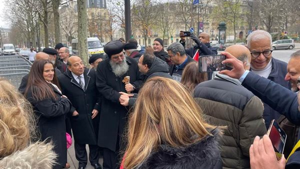 وحضر المواطنون المصريون رافعين أعلام مصر، وقاموا بالتقاط صور مع الأنبا مارك أسقف الكنيسة القبطية في باريس.