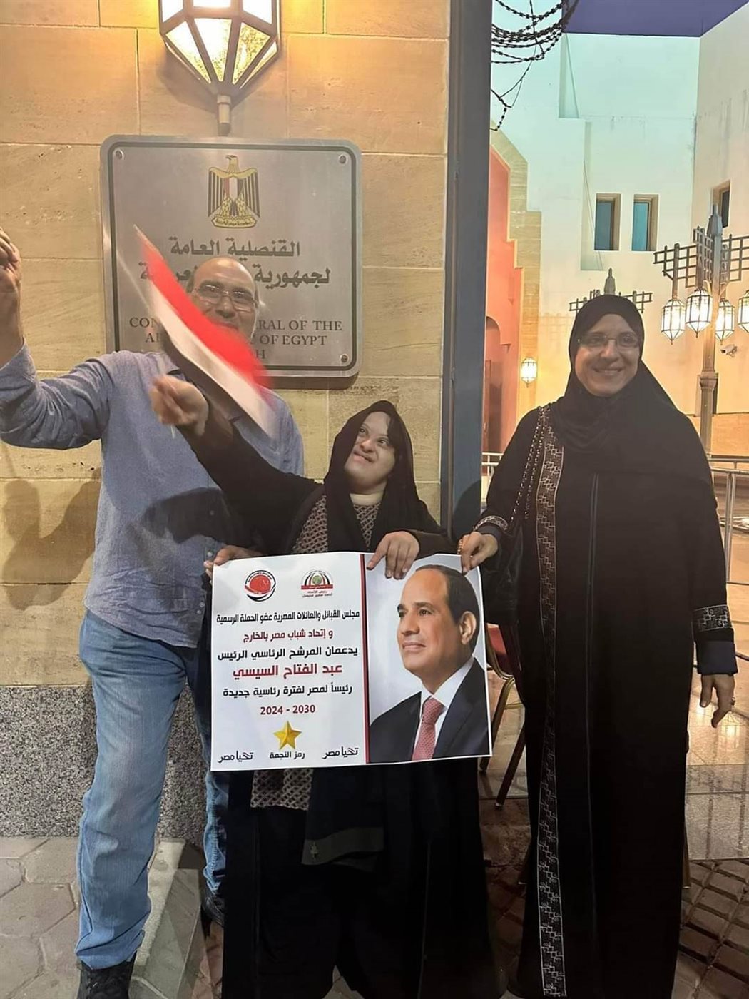 ويضيف محمد السادات عضو اتحاد شباب مصر بالخارج بالبحرين أننا سنظل أوفياء لوطننا مؤمنين به فمصر دائما في قلوبنا نفدبها بأرواحنا وذهابنا وشبابنا الي صناديق الإقتراع هو المساهمة الحقيقية في استقرار الوطن لإختيار مرشحنا السيد عبد الفتاح السيسي، ويضيف أحمد عليوة مشرف اتحاد شباب مصر بالخارج من الإمارات سعيد بالمشاركة الإيجابية الكبيرة لأبناء الجالية المصربة بدبي، فالوطن عزيز وغالي وكلنا متلاحمون يدا بيد لبناء مصر المستقبل مع القائد الذي أخلص لشعبة معا لدعم مرشحنا السيد عبدالفتاح السيسي.