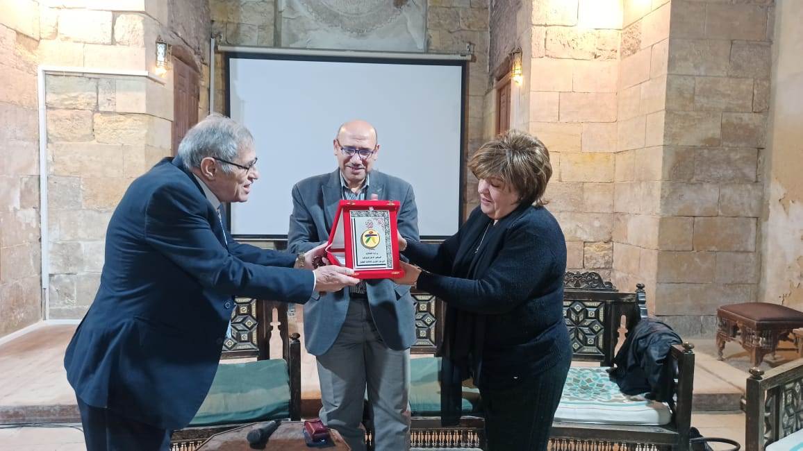 وفي نهاية اللقاء سلم الكاتب حسن الجوخ والكاتب محمد ناصف درع المركز القومي لثقافة الطفل للدكتورة هالة الشاروني، تكريما لاسم الراحل الكبير يعقوب الشاروني.