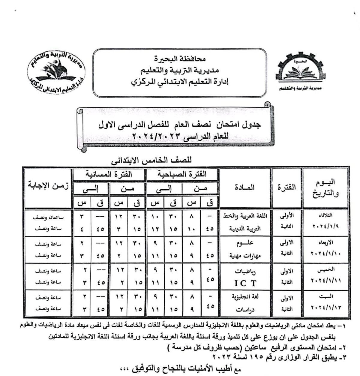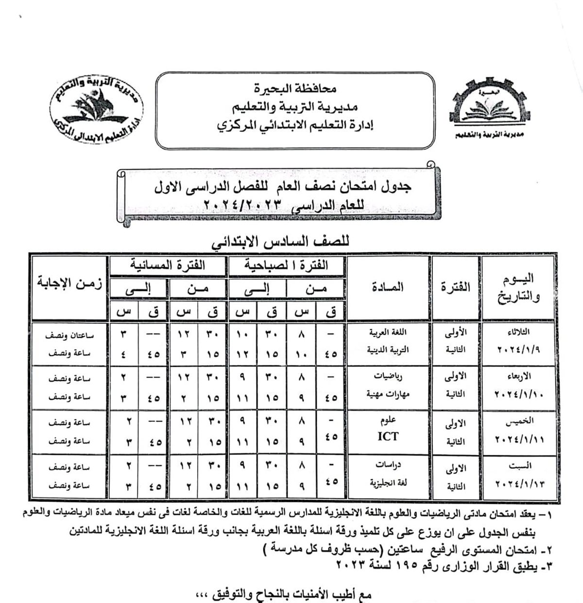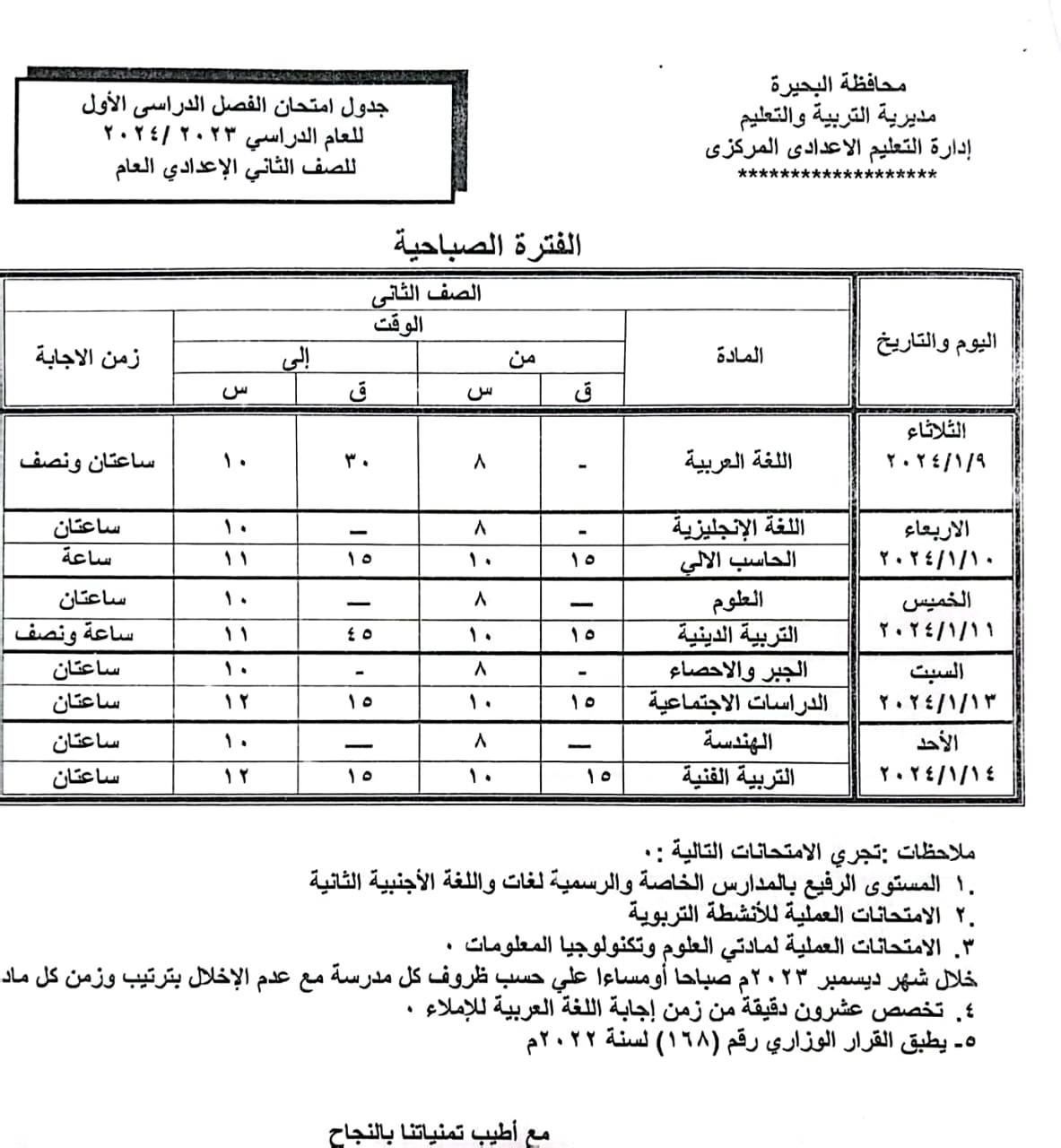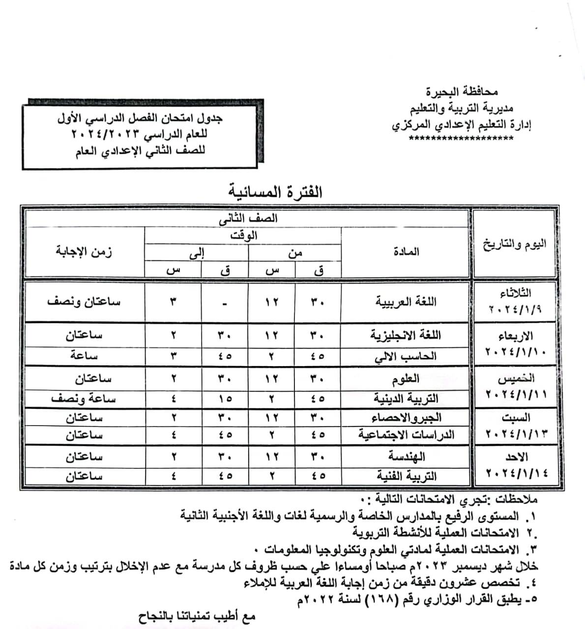 جدول امتحانات الفصل الدراسي الأول للشهادة الإعدادية بالبحيرة
