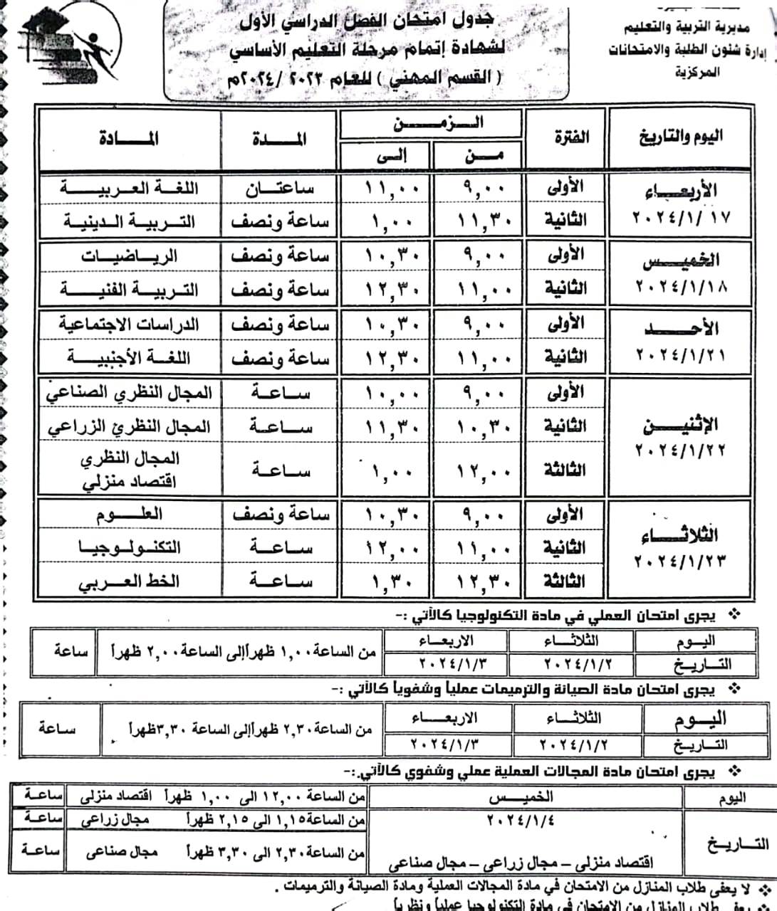 والشهادة الإعدادية العامة من الأربعاء 17 يناير 2024 وحتى الأربعاء 24 يناير 2024.