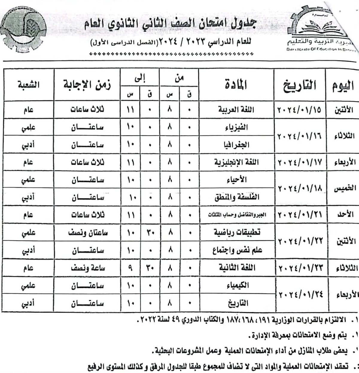 والصفوف الأول والثاني الثانوي الفني من الثلاثاء 2 يناير 2024 وحتى الأربعاء 24 يناير 2024.