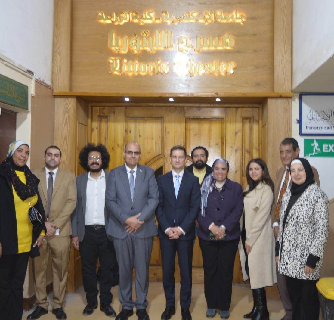 وفي كلمته نقل د. محمد بهي الدين تحيات رئيس الجامعة بسعادة السفير، وشكره على المشاركة فى دعم المركز الخدمى لسلسلة قيمة الطماطم المزمع إنشاؤه بالكلية بالتعاون مع منظمة الأمم المتحدة للتنمية الصناعية (UNIDO) وبدعم كامل من الجامعة وبمشاركة الخبراء من كلية الهندسة جامعة الأسكندرية وقسم علوم وتقنية الاغذية وقسم الخضر بالكلية، ولفت أن عمر المشروع حتى الآن حوالى ٣٠ شهراً ومن المتوقع افتتاحه خلال الاشهر القادمة، وأوضح أن المشروع يهدف إلى إنشاء مركز خدمى لسلسلة قيمة الطماطم داخل جامعة الإسكندرية للتدريب على عمليات تصنيع الطماطم وزيادة كمية الطماطم المصنعة بمصر التي لا تزيد حتى الآن عن ٣- ٤% من كمية الإنتاج التي تبلغ حوالى ٨ - ٩ مليون طن سنويا.