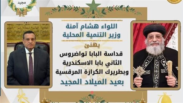 هنأ وزير التنمية المحلية هشام آمنة، قداسة البابا تواضروس الثاني بابا الإسكندرية وبطريرك الكرازة المرقسية بمناسبة عيد الميلاد المجيد.