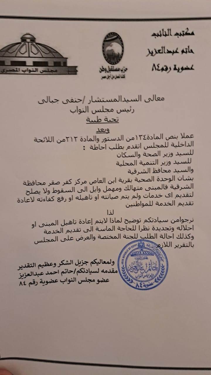 تقدم النائب حاتم عبدالعزيز ، عضو مجلس النواب عن محافظة الشرقية، بطلب إحاطة لوزير الصحة ووزير التنمية المحلية ومحافظ الشرقية، بسبب حرمان أكثر من 20 ألف مواطن بقرية ابن العاص مركز كفر صقر من الحصول علي خدمة صحية جيدة، بسبب تهالك مبني الوحدة الصحية بالقرية وعدم صلاحيته.