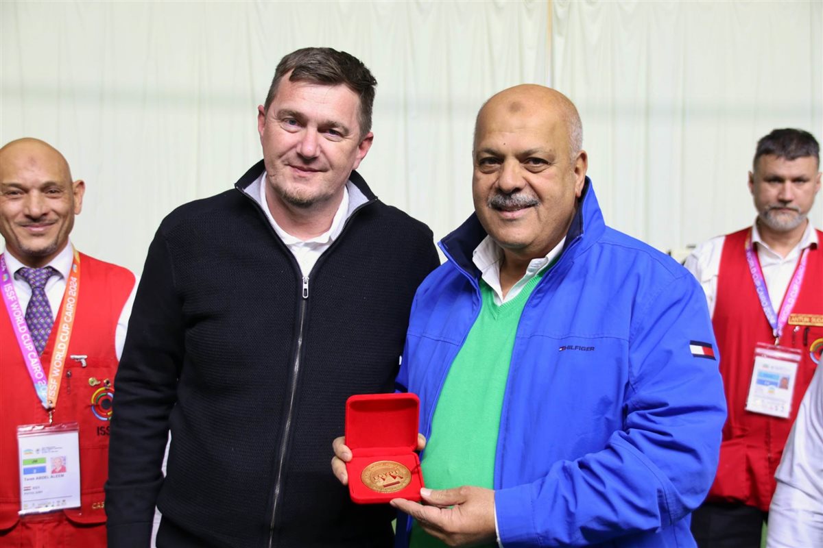 حازم حسني يكرم المندوب الفني للاتحاد الدولي للرماية
