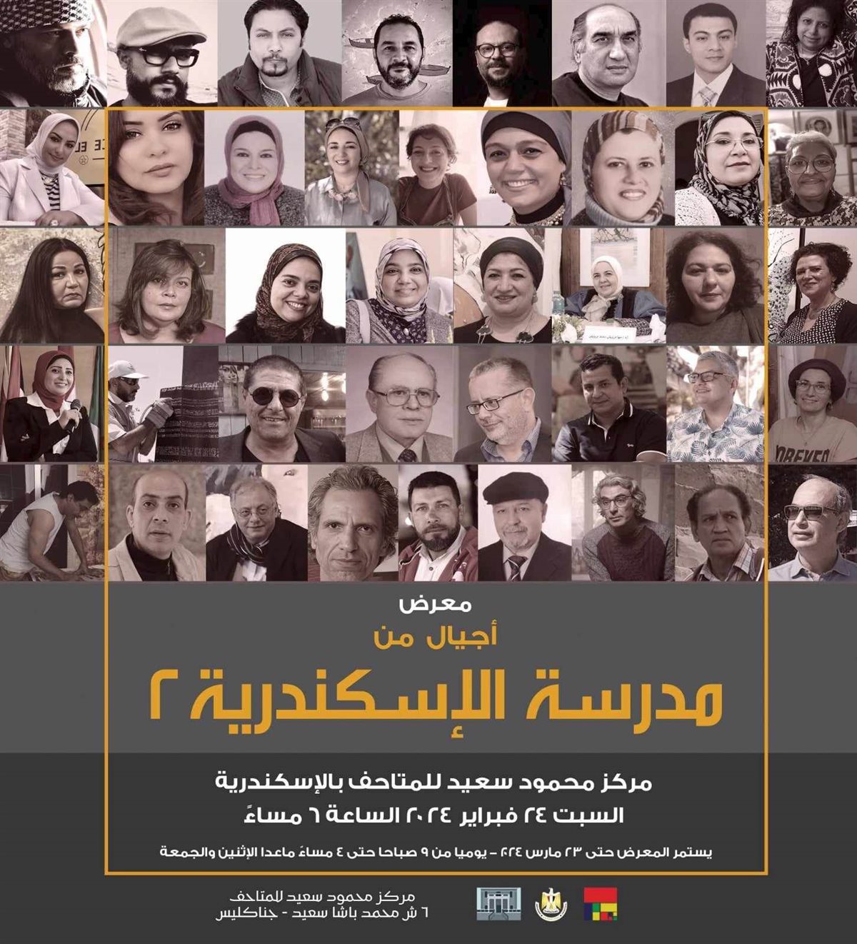 ضمن احتفالية مركز محمود سعيد للمتاحف بالأخوين وانلي، تنطلق تحت رعاية وزيرة الثقافة الأستاذة الدكتورة نيفين الكيلاني فعاليات النسخة الثانية من معرض "أجيال من مدرسة الإسكندرية" والذي يفتتحه الدكتور وليد قانوش رئيس قطاع الفنون التشكيلية يوم السبت الموافق 24 فبراير 2024 في تمام الساعة 6م بقاعتي أجيال 1، 2 بالمركز.