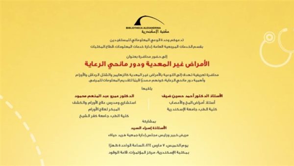 تنظم مكتبة الإسكندرية من خلال وحدة الوعي المعلوماتي بقطاع المكتبات محاضرة بعنوان (الأمراض غير المعدية ودور مانحي الرعاية)، وذلك يوم الخميس الموافق 7 مارس، في تمام الساعة الواحدة ظهراً، بقاعة الوفود بمركز مؤتمرات مكتبة الإسكندرية.
