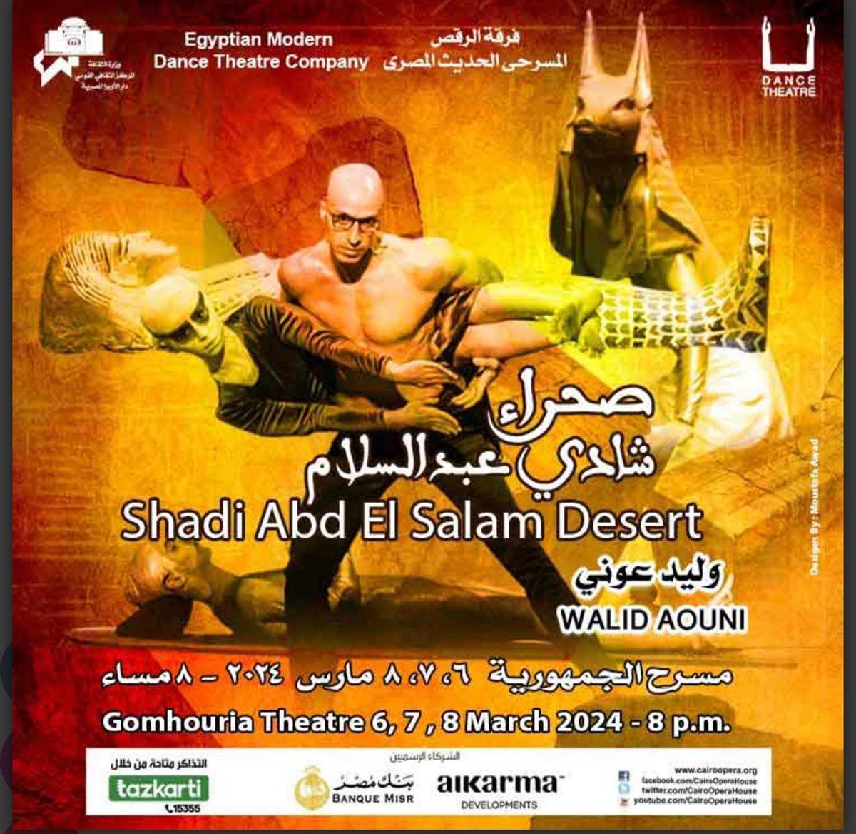تواصل وزارة الثقافة خطتها الهادفة إلى تقديم كنوز الإبداع المصري فى مختلف المجالات حيث تقدم دار الأوبرا برئاسة الدكتورة لمياء زايد بعد غياب 27 عاما عرض صحراء شادى عبد السلام لفرقة الرقص المسرحي الحديث تصميم واخراج وليد عونى، وذلك فى الثامنة مساء أيام الأربعاء، الخميس والجمعة 6، 7، 8 مارس 2024 على مسرح الجمهورية.