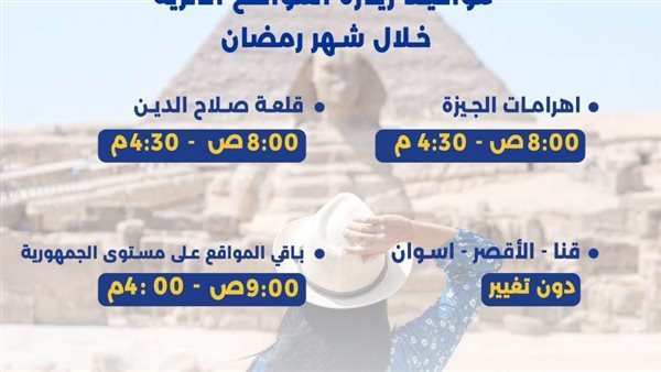 أما عن مواعيد الزيارة بالمواقع الأثرية فقد تقرر العمل بها من الساعة التاسعة صباحا وحتى الرابعة عصرا، فيما عدا منطقة آثار الهرم وقلعة صلاح الدين الأيوبي فسوف يتم فتحهما من الساعة الثامنة صباحا وحتى الرابعة والنصف عصرا.