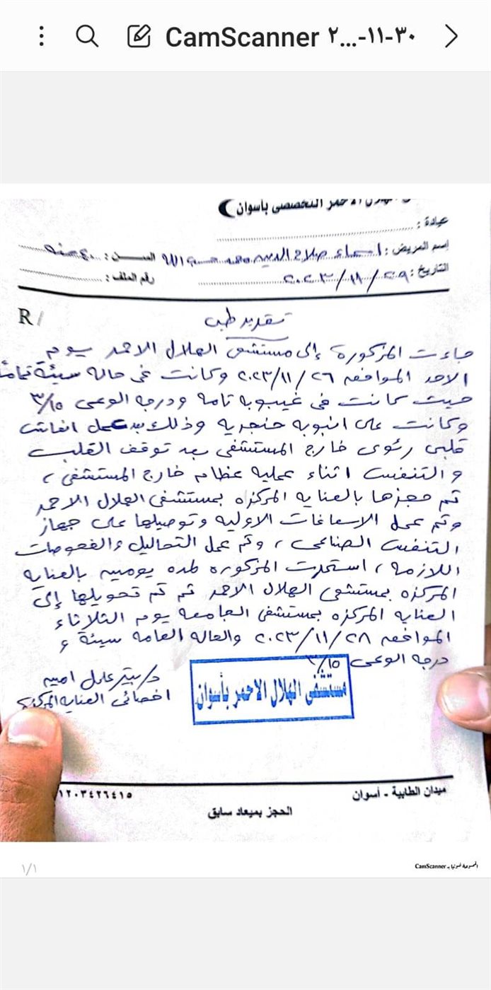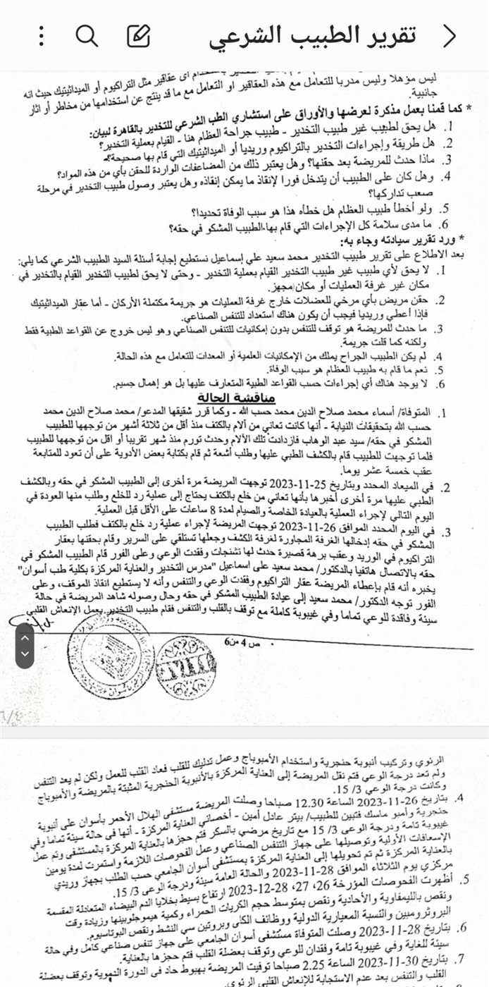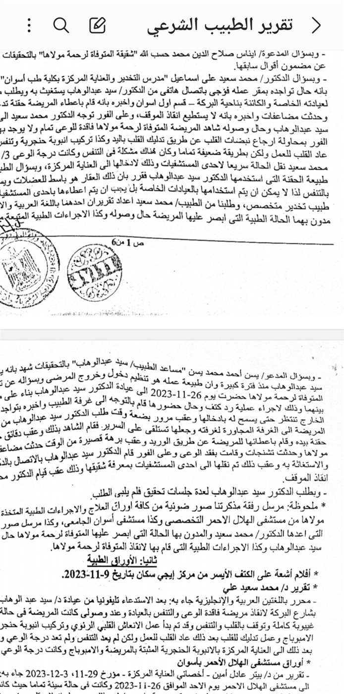 يذكر أنه ورد بلاغ يحمل رقم 16097 لسنة 2023 جنح أول أسوان، إلى نيابة قسم أول أسوان برئاسة المستشار محمد عصام مدير النيابة، مفاده تعرض أسماء صلاح الدين الدين محمد حسب الله 41 سنة، تقيم بمنطقة الخزان بمدينة أسوان، لخطأ طبي جسيم داخل أحد عيادات العظام الشهيرة بمنطقة البركة وسط أسوان، مما أسفر عنه وفاتها، على يد استشارى جراحة عظام شهير يدعى "سيد.ع . م".