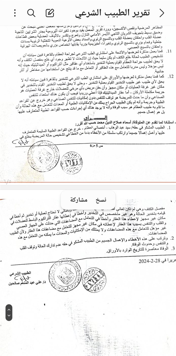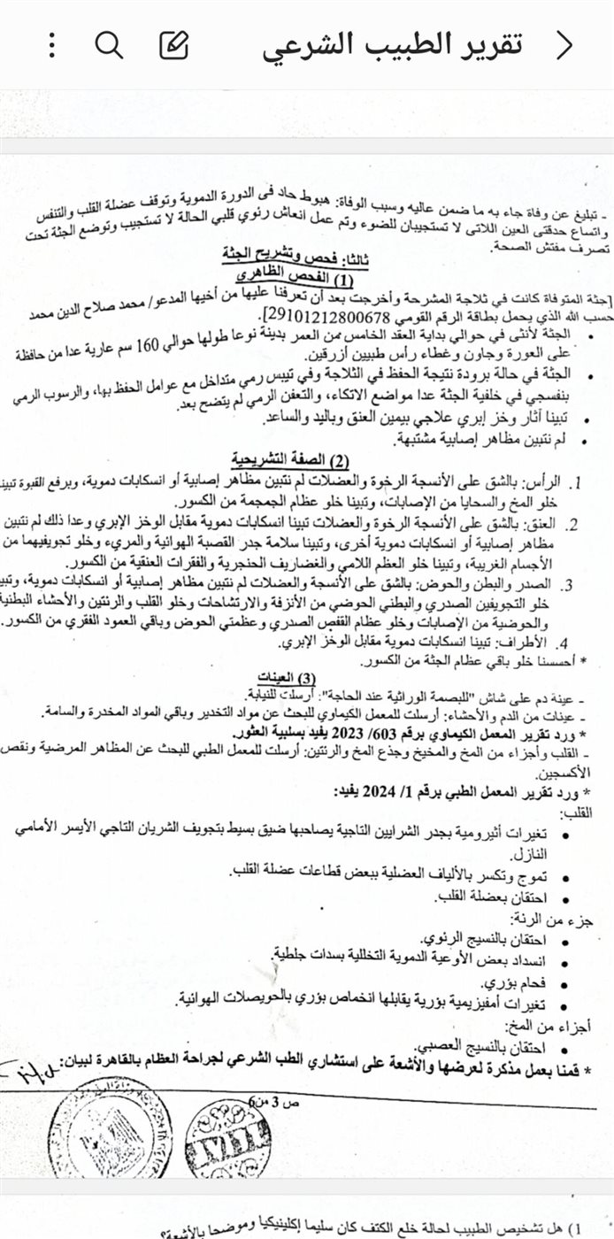 وأكد تقرير الطب الشرعى الوارد من مصلحة الطب الشرعى بالقاهرة، مطابقة ما جاء فى الصفة التشريحية للطبيب الشرعى "على عبد المنعم صالحين" والذي قام بفحص وتشريح الجثة بناء على طلب النيابة العامة فى القضية التي تحمل رقم 16097 لسنة 2023 جنح قسم أول أسوان.