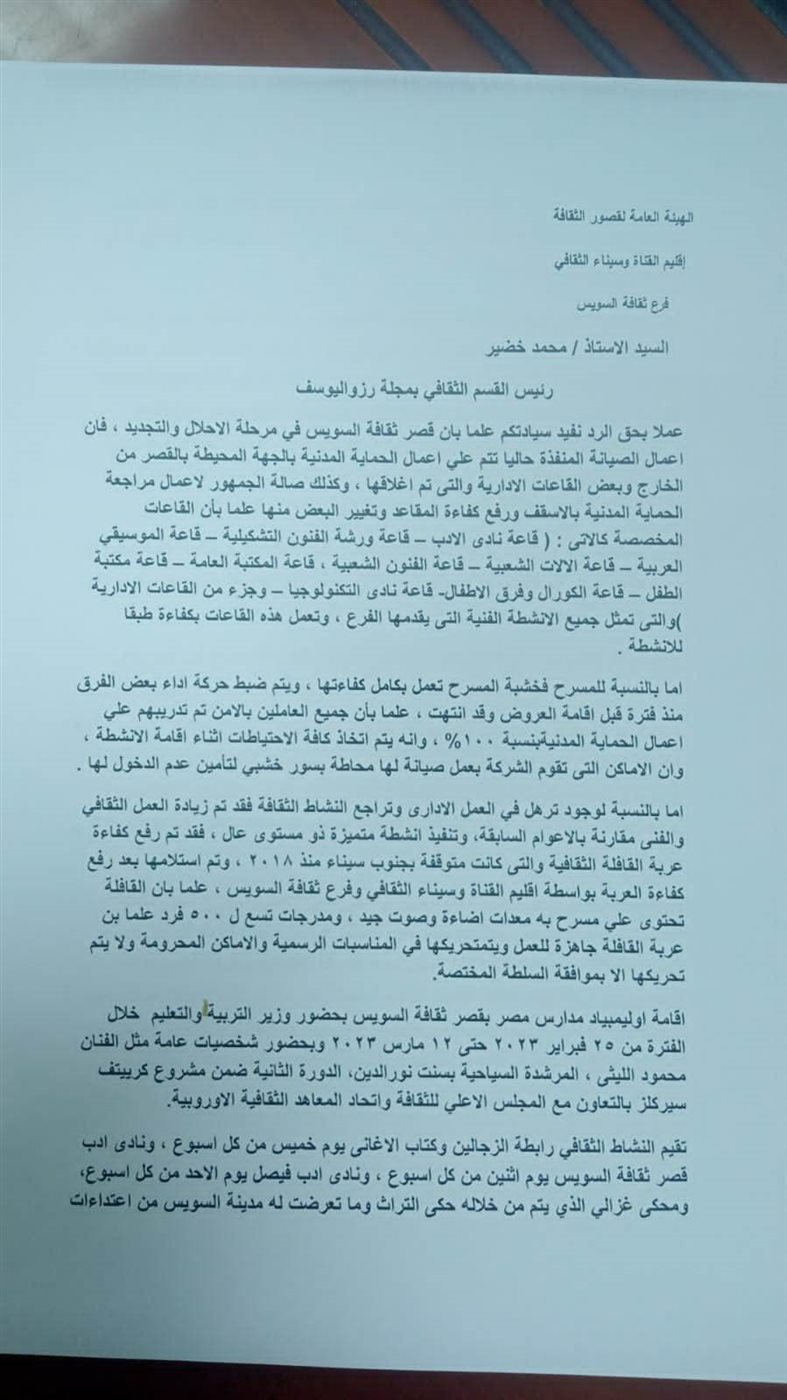نحيط سيادتكم علما بأن قصر ثقافة السويس بالفعل دخل في مرحلة الإحلال والتجديد، وأن أعمال الصيانة المنفذة حاليًا تتم على أعمال الحماية المدنية بالجهة المحيطة بالقصر من الخارج وبعض القاعات الإدارية، والتي تم إغلاقها، وكذلك صالة الجمهور لأعمال مراجعة الحماية المدنية بالأسقف ورفع كفاءة المقاعد وتغيير البعض منها، علما بأن باقي القاعات المخصصة كالآتي: "قاعة نادي الأدب– قاعة ورشة الفنون التشكيلية– قاعة الموسيقى العربية– قاعة الآلات الشعبية– قاعة الفنون الشعبية، قاعة المكتبة العامة– قاعة مكتبة الطفل– قاعة الكورال وفرق الأطفال- قاعة نادي التكنولوجيا– وجزء من القاعات الإدارية والتي تمثل جميع الأنشطة الفنية التي يقدمها الفرع"، وتعمل هذه القاعات بكفاءة طبقا لخطة الانشطة.