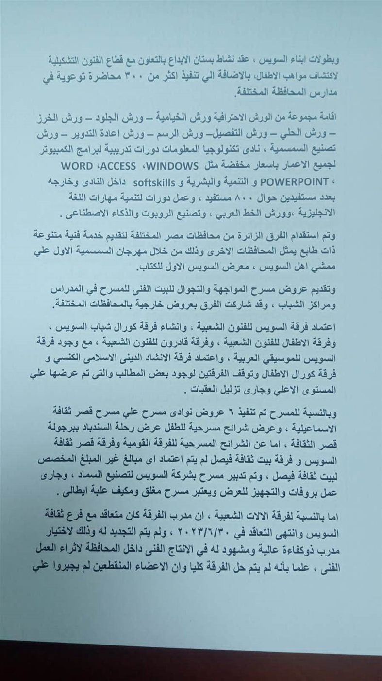 أما بالنسبة لوجود ترهل في العمل الإداري وتراجع النشاط الثقافي فقد تم زيادة العمل الثقافي والفني مقارنة بالأعوام السابقة، وتنفيذ أنشطة متميزة ذات مستوى عال، فقد تم رفع كفاءة عربة القافلة الثقافية والتي كانت متوقفة بجنوب سيناء منذ 2018، وتم استلامها بعد رفع كفاءة القافلة بواسطة إقليم القناة وسيناء الثقافي وفرع ثقافة السويس.