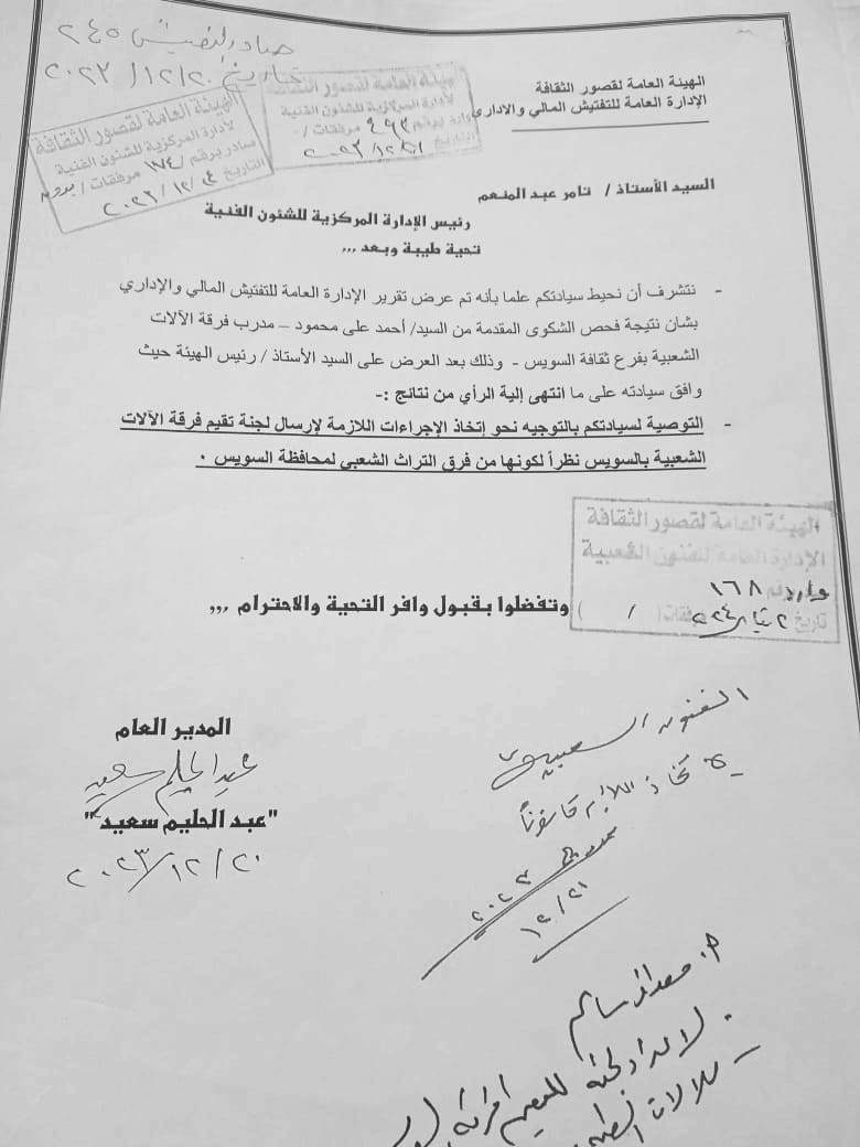 وقد تم مخاطبة الإدارة المركزية لإقليم القناة وسيناء الثقافي لمخاطبة الإدارة المركزية للشؤون الفنية لسرعة اعتماد الفرقة، علما بأن الفرع لديه فرقة شبيهة تقدم تراث السمسمية وجميع أعضائها من الشباب المحترفين وهي الفرقة المصاحبة لفرقة السويس للفنون الشعبية.