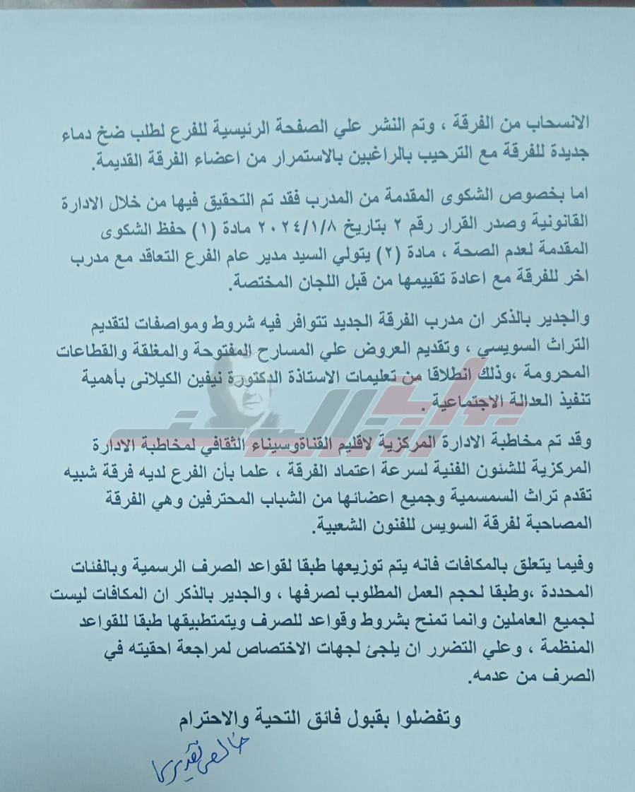أما بخصوص الشكوى المقدمة من المدرب فقد تم التحقيق فيها من خلال الإدارة القانونية، وصدر القرار رقم 2 بتاريخ 8/1/2024: مادة 1- حفظ الشكوى المقدمة لعدم الصحة، مادة 2- يتولى السيد مدير عام الفرع التعاقد مع مدرب آخر للفرقة مع إعادة تقييمها من قبل اللجان المختصة.