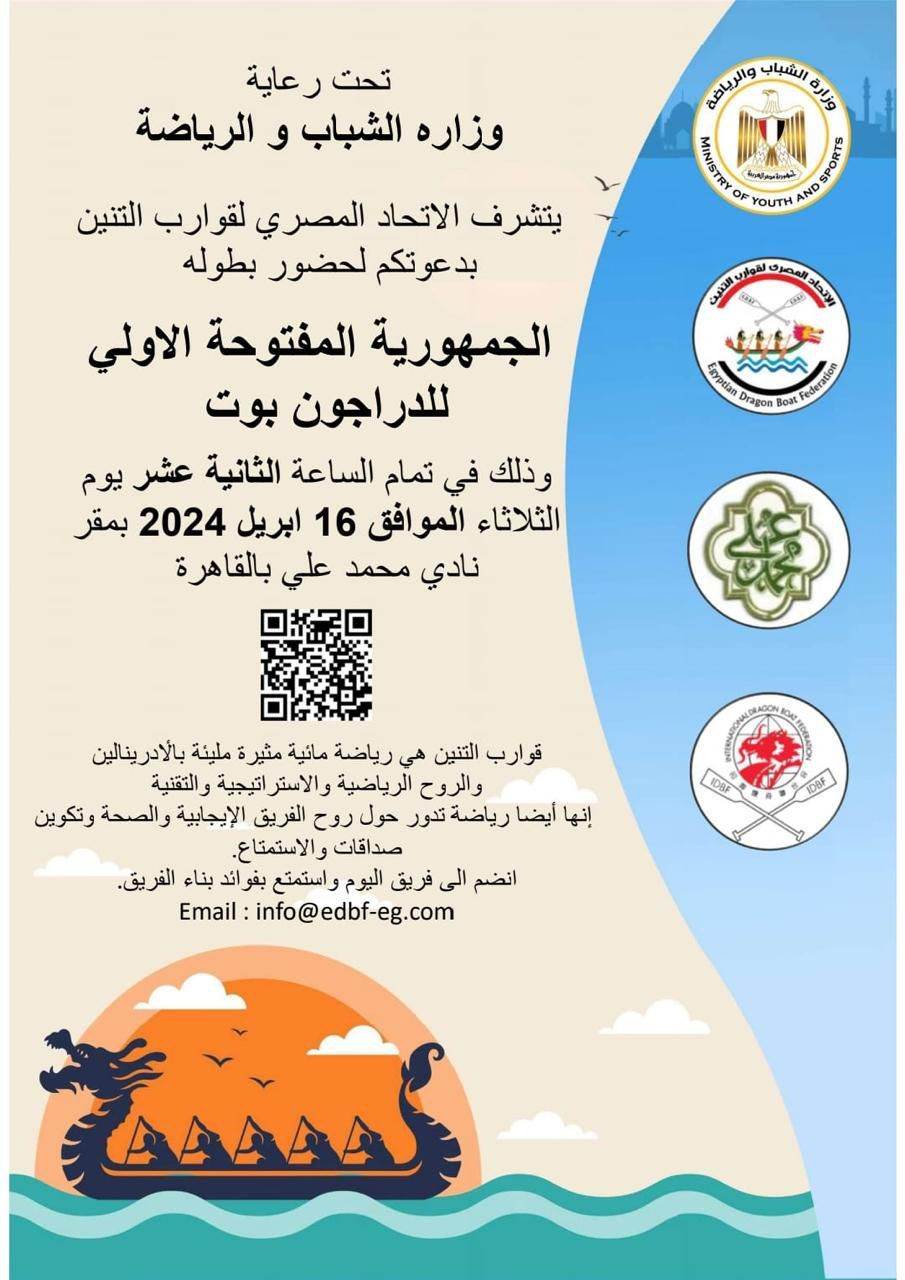 تقام يوم الثلاثاء المقبل (16 إبريل) بطولة الجمهورية المفتوحة الأولى لقوارب التنين، بمقر نادي محمد علي المطل على نيل القاهرة تحت رعاية الدكتور أشرف صبحي، وزير الشباب والرياضة.