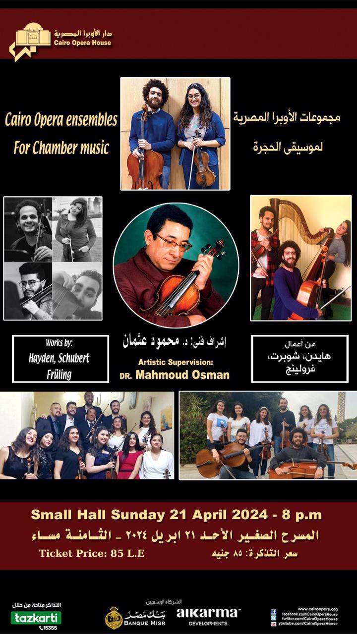 ضمن توجهات وزارة الثقافة لإلقاء الضوء على أشكال الابداع العالمي تنظم دار الأوبرا المصرية برئاسة الدكتورة لمياء زايد حفلا لمجموعات الأوبرا المصرية لموسيقى الحجرة لآلات الكمان، الڤيولا والتشيللو تحت إشراف الدكتور محمود عثمان، وذلك في الثامنة مساء الأحد ٢١ إبريل على المسرح الصغير .