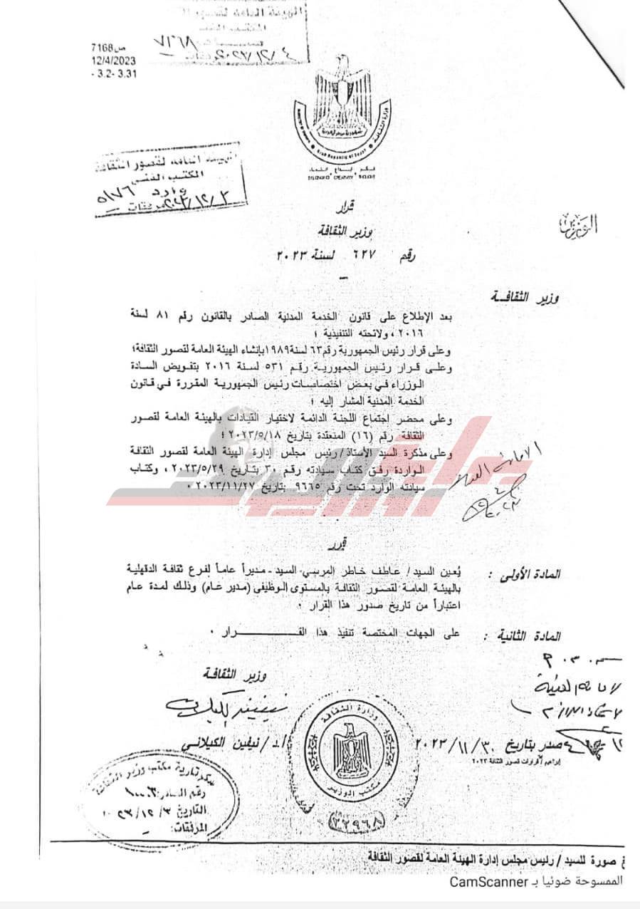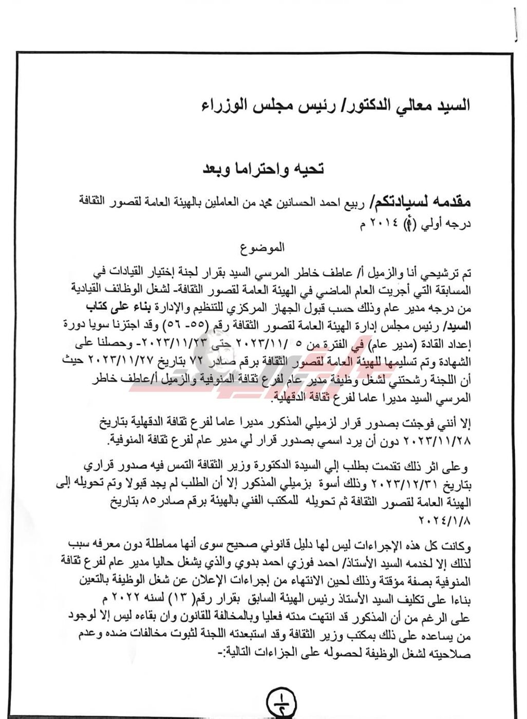 وحين تقدم بطلب إلى الدكتورة وزيرة الثقافة يلتمس فيه صدور قرار تعيينه مديرا لفرع ثقافة المنوفية بتاريخ ٢٠٢٣ - ١٢ - ٣١؛ لم يجد طلبه قبولا عند الوزارة ليتم تحويله إلى الهيئة العامة لقصور الثقافة برقم ٨٥ بتاريخ ٢٠٢٤ - ١ - ٨.