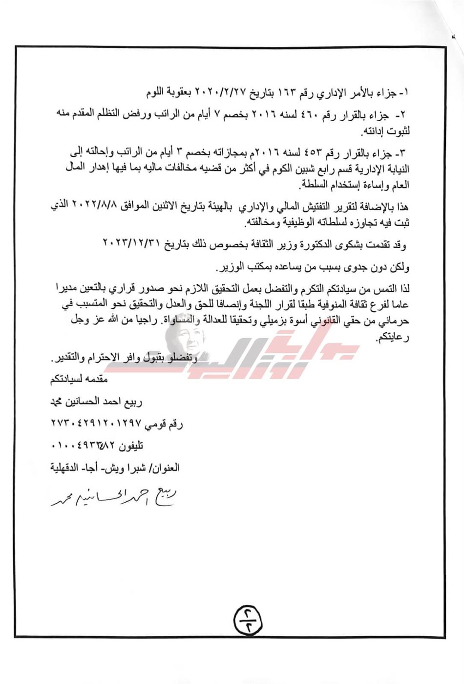 كما تقدم أيضا بشكوى لهيئة الرقابة الإدارية بتاريخ ٢٠٢٤ - ٢ - ١٨ م، وتقدم بشكوى للنائب العام ضد وزير الثقافة ورئيس الهيئة بتهمة إهدار المال العام والتسهيل للغير الاستيلاء على المال العام؛ وذلك ببقاء المدير العام في مكانه مع العلم بكل ما يفعله من مخالفات وتجاوزات بالمكتب الرئيسي بالرحاب رقم ٦١٥١ بتاريخ ٢٠٢٤ - ١ - ٣١ عريضة رقم ٦٦٦٧٥٤ لكن تم حفظها دون أي تحقيق برقم ١٥٦١ لسنة ٢٠٢٤ إداري ثانٍ المنصورة.
