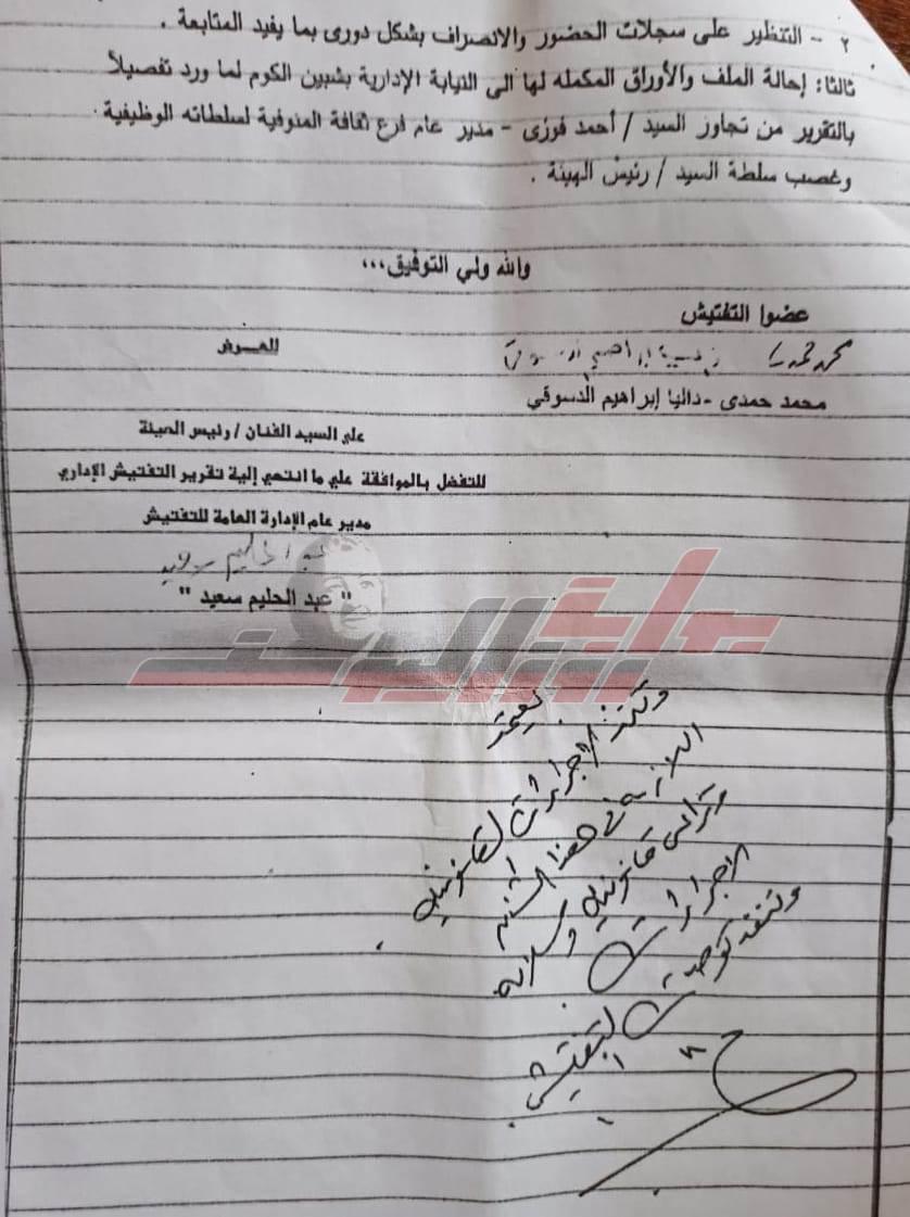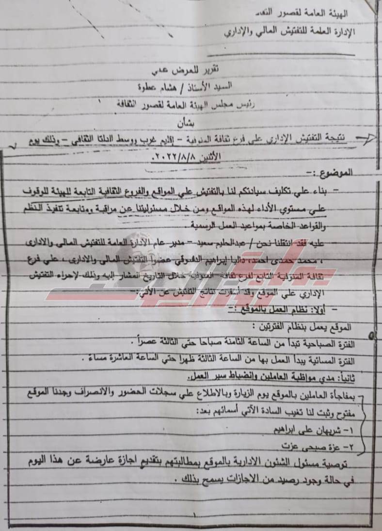 كل هذا بالإضافة إلى تقرير التفتيش المالي والإداري بالهيئة العامة لقصور الثقافة بتاريخ ٢٠٢٢ - ٨ – ٨، الذي ثبت فيه تجاوزه سلطاته الوظيفية ومخالفته، وكل هذا مثبت ومرفق بالمستندات ومعلوم لدى الهيئة العامة لقصور الثقافة.