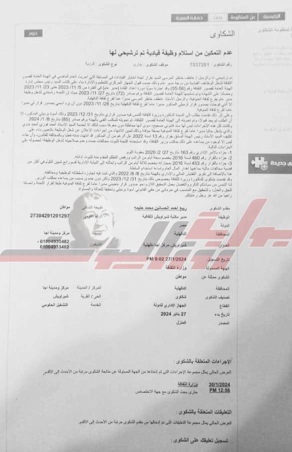 كما تقدم المرشح لإدارة فرع ثقافة المنوفية بشكوى على البوابة الإلكترونية لمنظومة الشكاوى الحكومية برئاسة مجلس الوزراء بتاريخ ٢٠٢٤ - ١ - ٢٧ برقم ٧٥٣٧٢٨١ وإلى الآن جارٍ البحث دن اتخاذ أي إجراء.