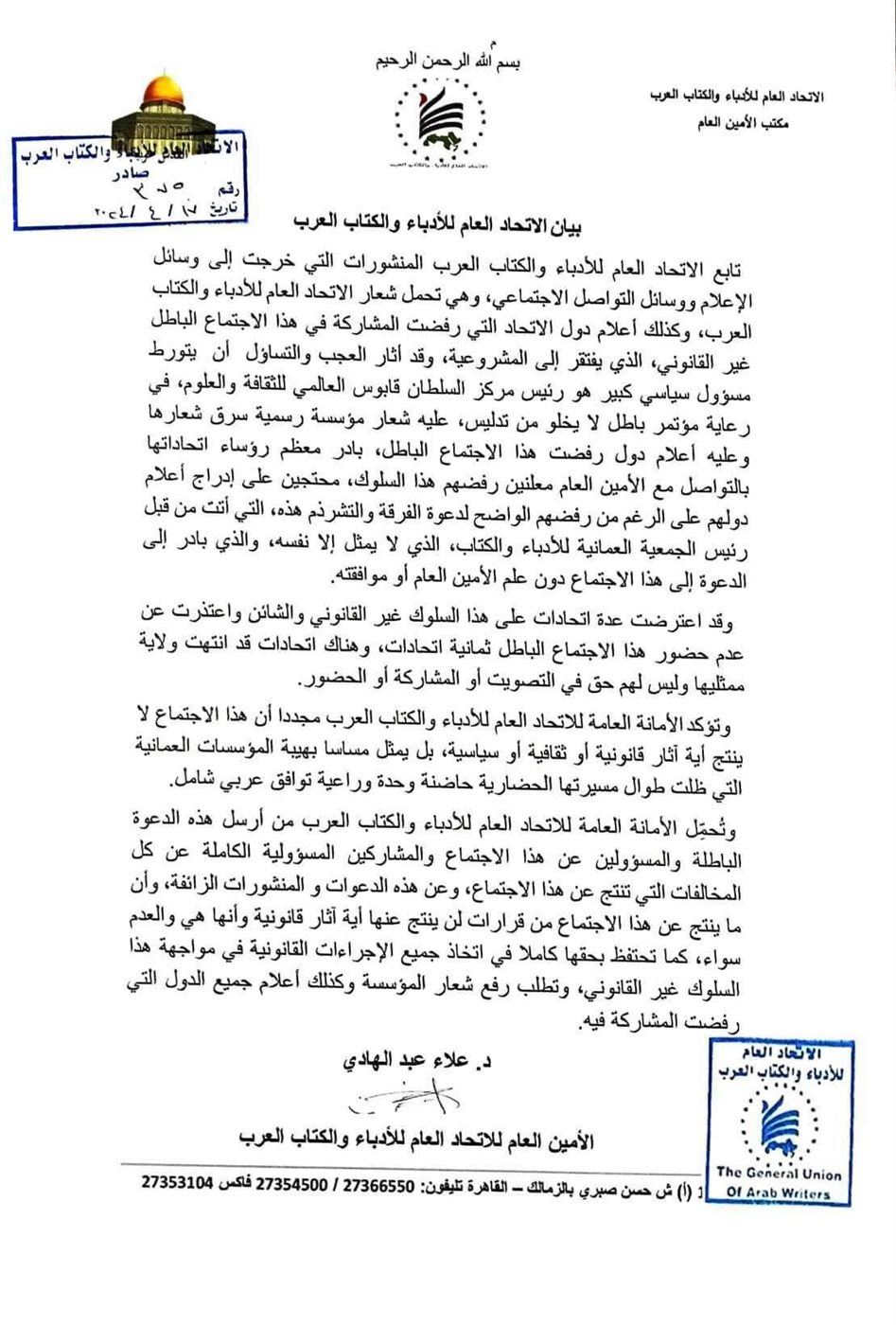 رؤساء اتحادات الكتاب والأدباء العرب يدينون اختراق النظام الاساسي ويتمسكون بقيادة عبدالهادي