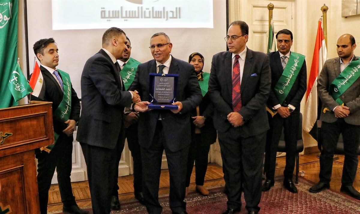 وفي نهاية الندوة كرم الدكتور عبدالسند يمامة رئيس الوفد اللواء الدكتور أحمد الشحات وأهداه درع الوفد.