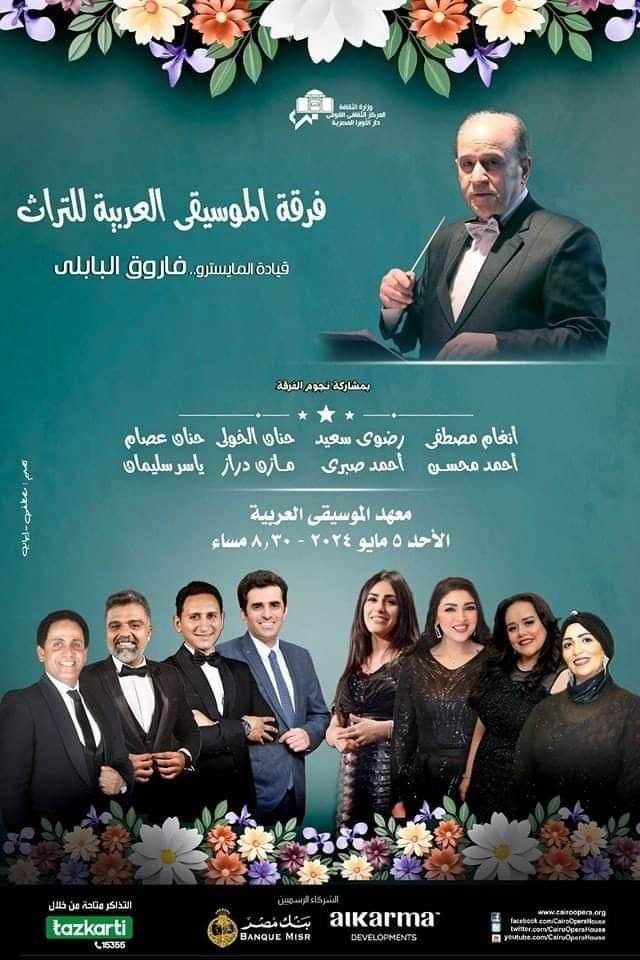 استمرار لفعاليات الثقافة المصرية في تقديم روائع الموسيقى العربية تنظم دار الأوبرا برئاسة الدكتورة لمياء زايد، حفلا لفرقة الموسيقى العربية للتراث بقيادة المايسترو فاروق البابلي في الثامنة والنصف مساء الأحد 5 مايو 2024 على مسرح معهد الموسيقى العربية.