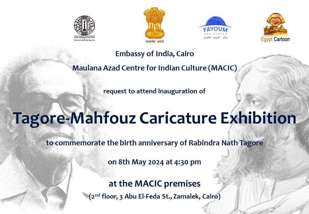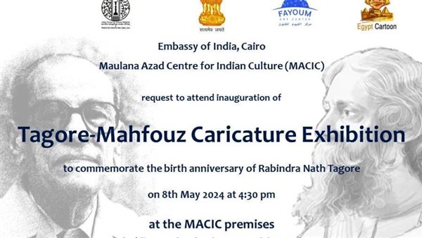 بمناسبة الاحتفال بذكرى ميلاد طاغور، يستضيف مركز مولانا آزاد الثقافي الهندي بالزمالك، معرضًا للبورتريه الكاريكاتيري تحت عنوان "طاغور- محفوظ"، وذلك يوم الأربعاء الموافق 8 مايو الجاري 2024، في تمام الساعة 4:30 عصرًا.