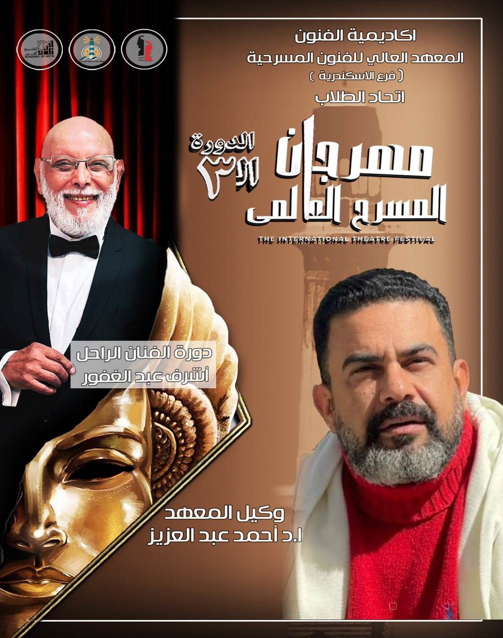 في إطار دعم وزارة الثقافة للأحداث والفعاليات الهامة التي تنظمها قطاعات وزارة الثقافة ينظم المعهد العالي للفنون المسرحية فرع الإسكندرية برعاية الاستاذ الدكتور غادة جبارة رئيس أكاديمية الفنون وإشراف الاستاذ الدكتور أحمد عبد العزيز وكيل المعهد مهرجان المسرح العالمي في دورته الثالثة، والتي تحمل اسم الفنان الراحل “أشرف عبد الغفور” وذلك الفترة من 9 إلى 12 مايو الجاري والمهرجان برئاسة الفنان مصطفى عسكر ويترأس اتحاد طلاب المعهد الفنان محمد عصمت.