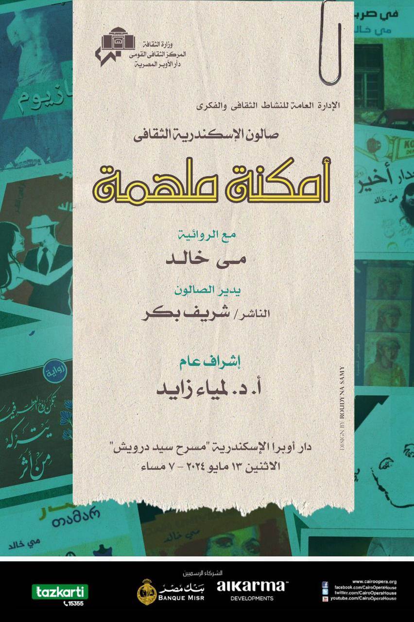 ضمن فعاليات الثقافة المصرية التنويرية تعقد دار الاوبرا برئاسة الدكتورة لمياء زايد، لقاء لصالون أوبرا الإسكندرية الثقافى تحت عنوان "أمكنة ملهمة" بمشاركة الروائية مي خالد ويديره الناشر شريف بكر وذلك في السابعة مساء الاثنين 13 مايو 2024 على مسرح سيد درويش "أوبرا إسكندرية".