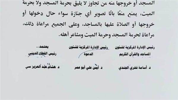 وقالت الأوقاف نظرًا لما لوحظ في تصوير بعض الجنائز أثناء الصلاة عليها أو دخولها المسجد أو خروجها منه من تجاوز لا يليق بحرمة المسجد ولا بحرمة الميت، يمنع منعًا باتًا تصوير أي جنازة سواء حال دخولها أو خروجها أو الصلاة عليها بالمساجد، وعلى الجميع مراعاة ذلك، مراعاة لحرمة المسجد وحرمة الميت ومشاعر أهله.
