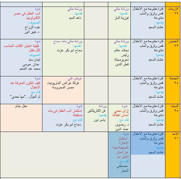 وفي سادس يوم: «فترة مفتوحة مع الأطفال قص ولزق والعاب متنوعة يقدمها: هشام السعيد، وورشة حكى ورسم تقدمها: منى حسين، وندوة النظام الغذائي الصحي للأطفال لقاء مع: د. سمر فتحي صديق، وندوة قصص الأطفال المترجمة فوائد وأضرار، بمشاركة مصطفى غنايم، وعاطف عبد المجيد».