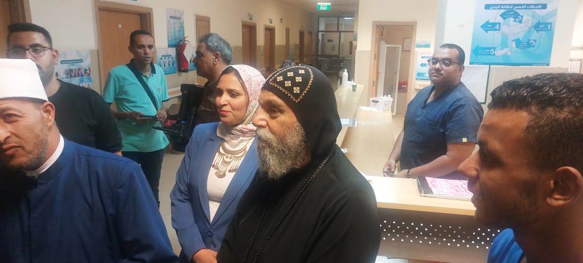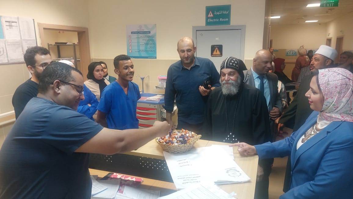 كان في استقبال الوفد الدكتور أشرف حماد مدير فرع هيئة الرعاية الصحية بأسوان، والدكتورة فاطمة سعيد نائب مدير مستشفى أسوان التخصصي، وضم الوفد الدكتور محمود عبد الرحيم مدير شؤون الإدارات بالأوقاف بأسوان نائبا عن وكيل وزارة الأوقاف، والأنبا بيشوى أسقف أسوان وتوابعها، والدكتور أحمد غلاب رئيس جامعة أسوان السابق، وأمين حزب المصرين المصريين الأحرار، والشيخ عبد الله عرجون مدير إدارة المساجد بالأوقاف بأسوان، وعدد من القيادات الشعبية والتنفيذية والدينية بالمحافظة.