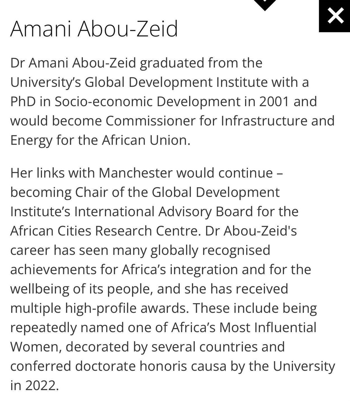 تخرجت الدكتورة أماني أبو زيد في الجامعة وحصلت على بدرجة الدكتوراه في التنمية الاجتماعية والاقتصادية في عام 2001 لتصبح فيما بعد مفوضة للبنية التحتية والطاقة بالاتحاد الأفريقي. و استمر ارتباطها بجامعة مانشستر لتصبح رئيسة المجلس الاستشاري الدولي لمعهد التنمية العالمية و لمركز أبحاث المدن الأفريقية. شهدت مسيرة الدكتورة أبو زيد العديد من الإنجازات المعترف بها عالميا من أجل التكامل في أفريقيا ورفاهية شعوبها، وحصلت على العديد من الجوائز رفيعة المستوى و يشمل ذلك اختيارها مرارا واحدة من أكثر النساء نفوذا في أفريقيا، وتم منحها عددا من الأوسمة من قبل العديد من البلدان ومنحت الدكتوراه الفخرية من قبل الجامعة في عام 2022*