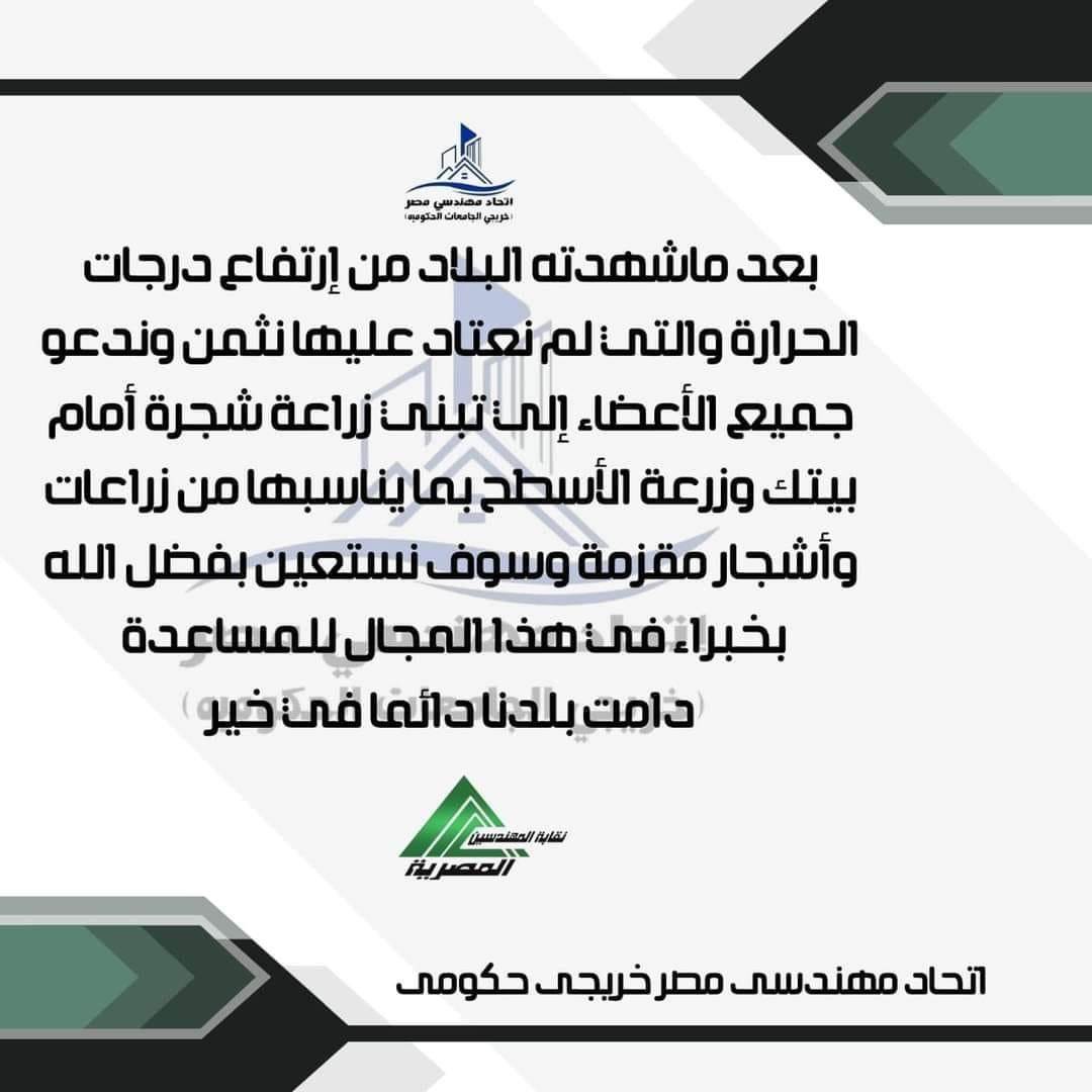 جاء ذلك بعد ما شهدته البلاد من ارتفاع درجات الحرارة والتي لم نعتد عليها نثمن وندعو جميع الأعضاء إلى تبنى زراعة شجرة أمام بيتك وزرعة الأسطح بما يناسبها من زراعات وأشجار متقزمة وسوف نستعين بفضل الله بخبراء في هذا المجال للمساعدة.