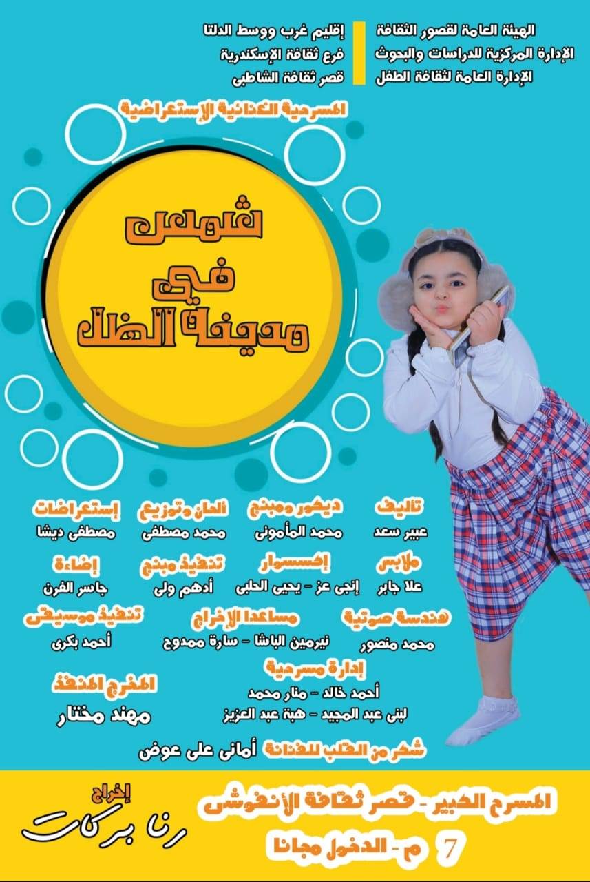 "شمس في مدينة الظل" شريحة الطفل بقصر ثقافة الشاطبي، ألحان وتوزيع محمد مصطفى، تصميم ديكور وفيديو مابينج محمد المأموني، استعراضات مصطفى عبده، هندسة صوتية محمد منصور، تصميم إضاءة جاسر الفرن، إكسسوارات أنجي عز الدين ويحيى عصام، تصميم وتنفيذ الملابس علا جابر، مخرج مساعد نرمين الباشا وسارة ممدوح، مخرج منفذ مهند مختار، وإخراج رنا بركات.