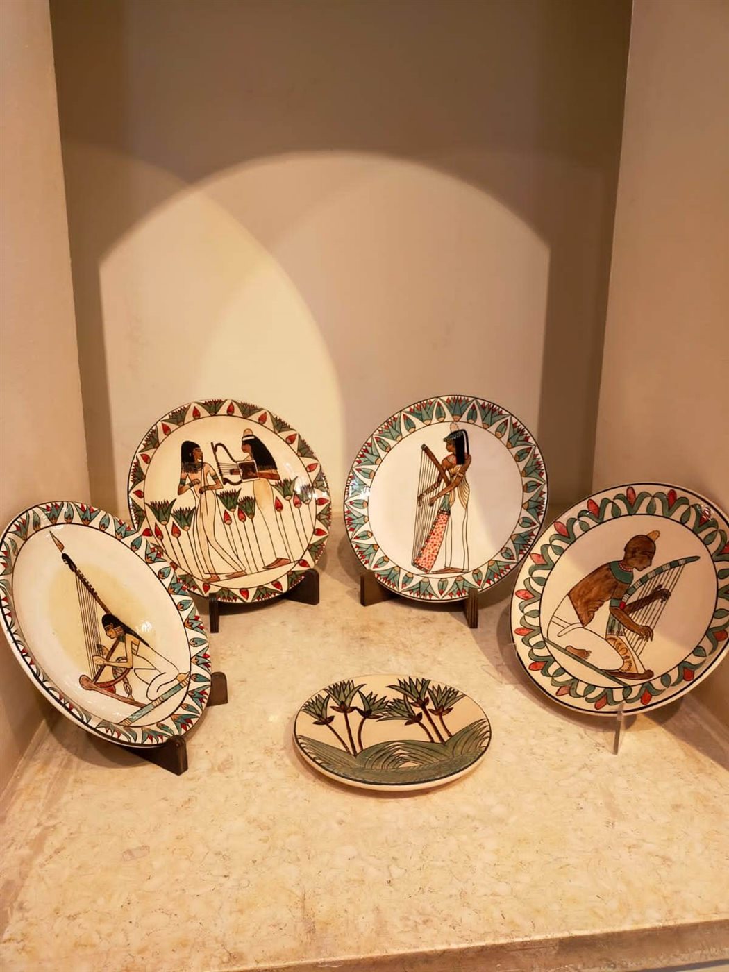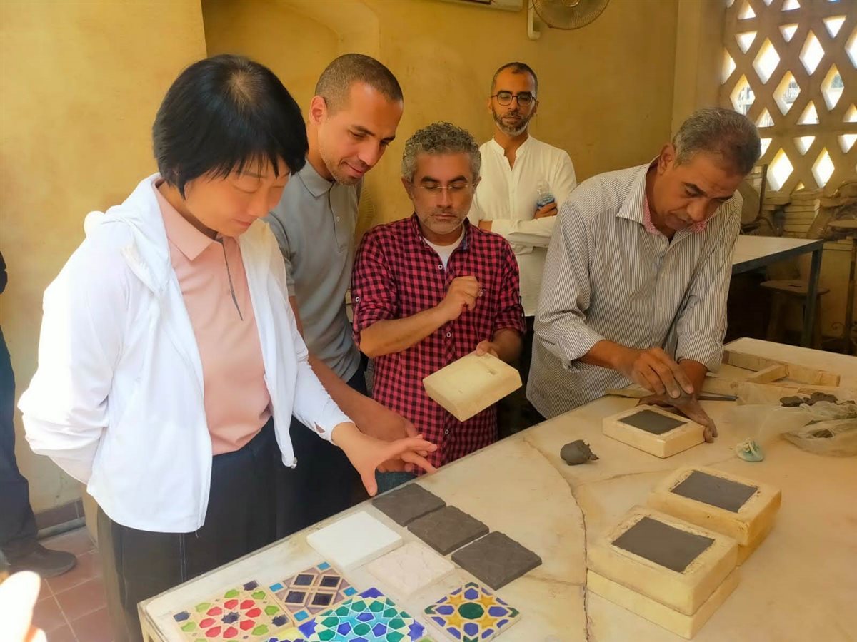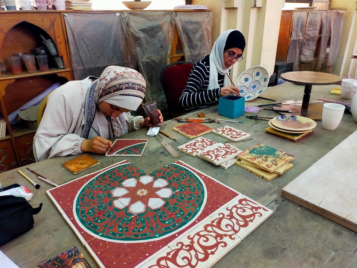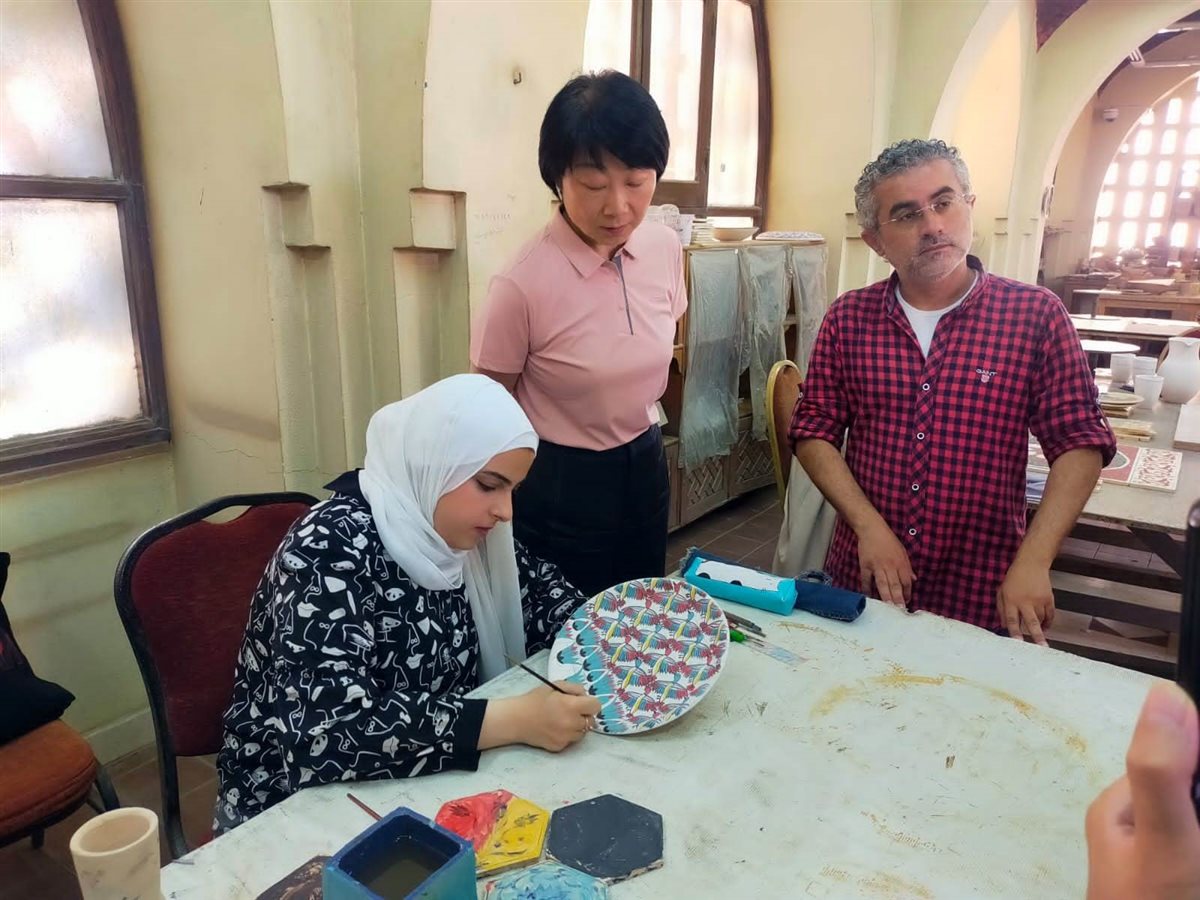 بعد ذلك قام الوفد بزيارة لمركز الحرف التقليدية بالفسطاط- التابع لقطاع الصندوق- حيث زاروا ورش التصنيع واتيليهات الفنانين للرسم على الخزف وتصنيعه، وكذلك أعمال النحاس والارابيسك.