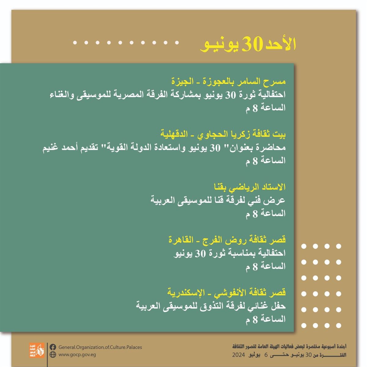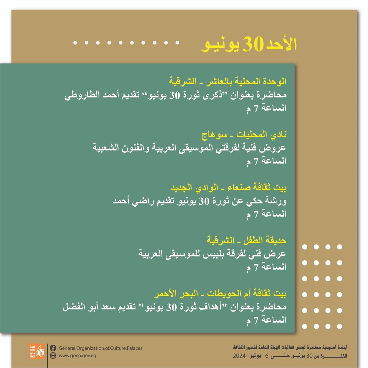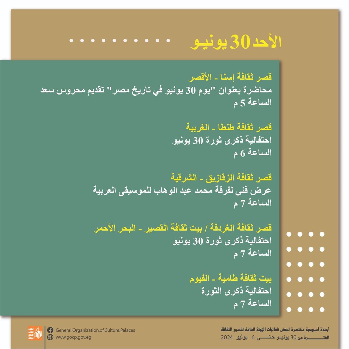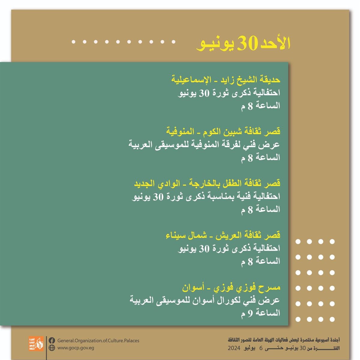 وتقدم هيئة قصور الثقافة اليوم الأحد ما يقرب من 40 فعالية واحتفالية متنوعة بالقاهرة والمحافظات بمناسبة الذكرى الحادية عشرة لثورة 30 يونيو تتنوع بين العروض الفنية لفرق الموسيقى العربية والفنون الشعبية، واللقاءات التثقيفية والورش الفنية.