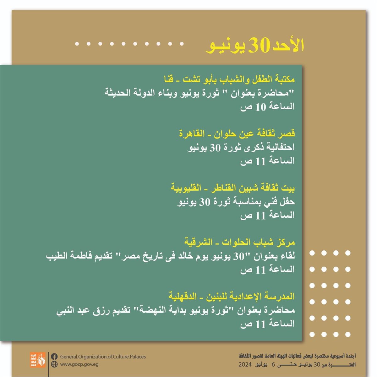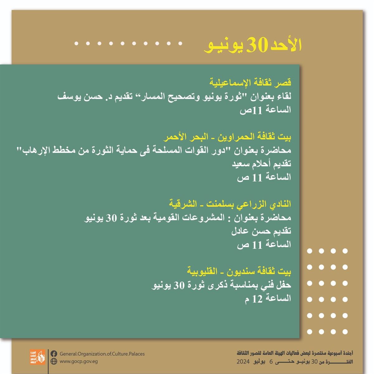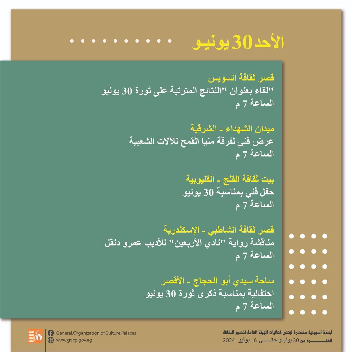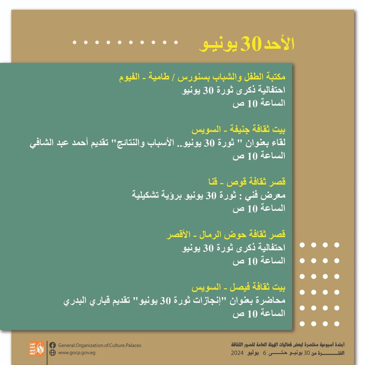 وتقدم هيئة قصور الثقافة اليوم الأحد ما يقرب من 40 فعالية واحتفالية متنوعة بالقاهرة والمحافظات بمناسبة الذكرى الحادية عشرة لثورة 30 يونيو تتنوع بين العروض الفنية لفرق الموسيقى العربية والفنون الشعبية، واللقاءات التثقيفية والورش الفنية.
