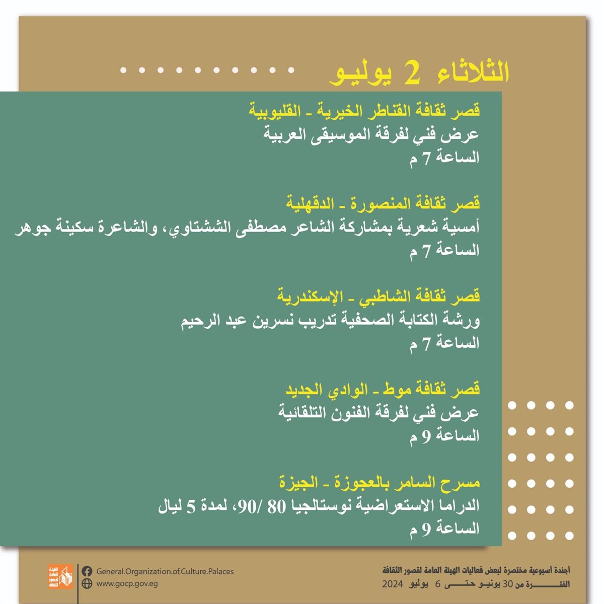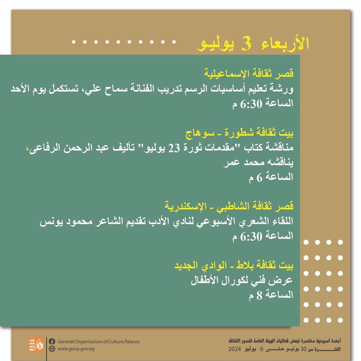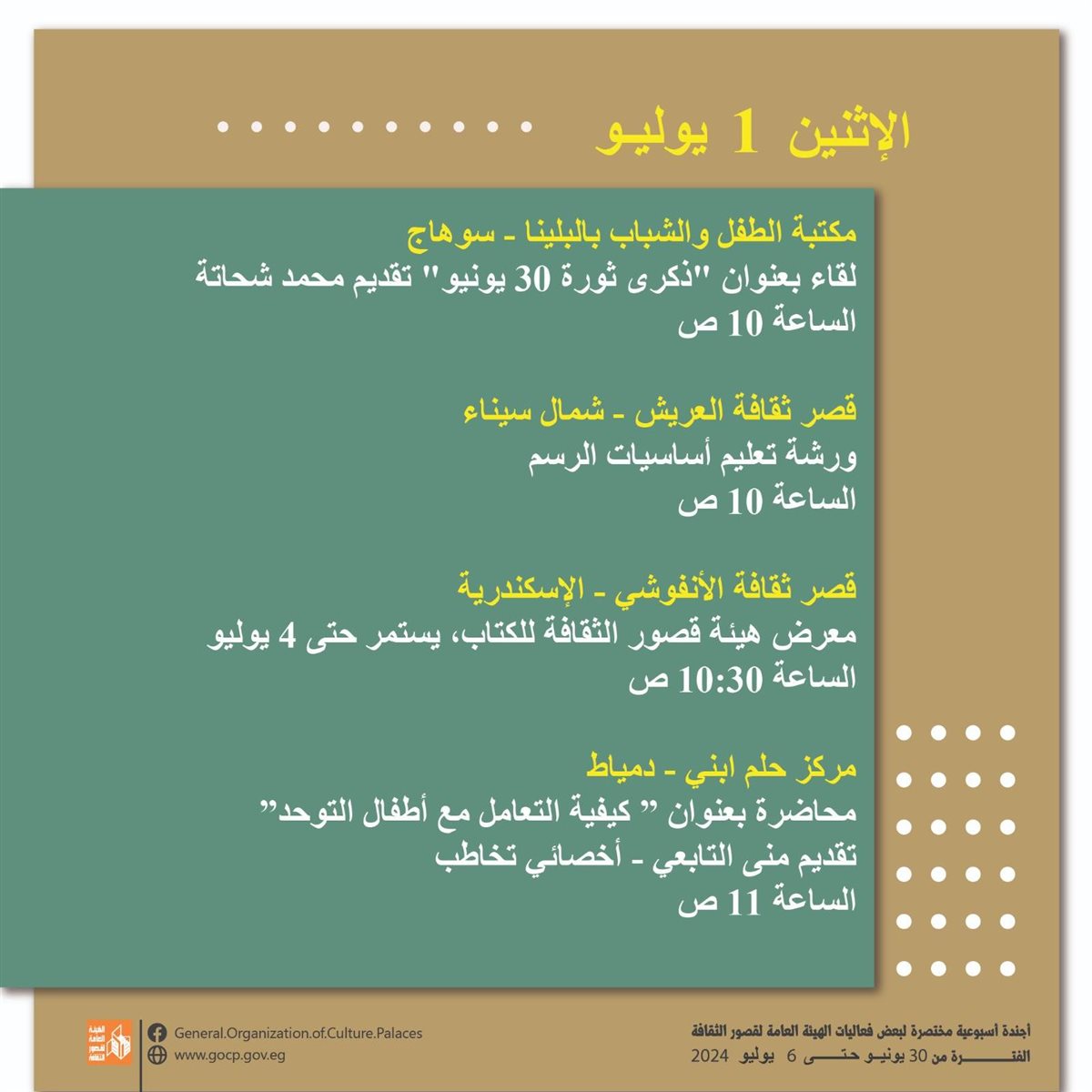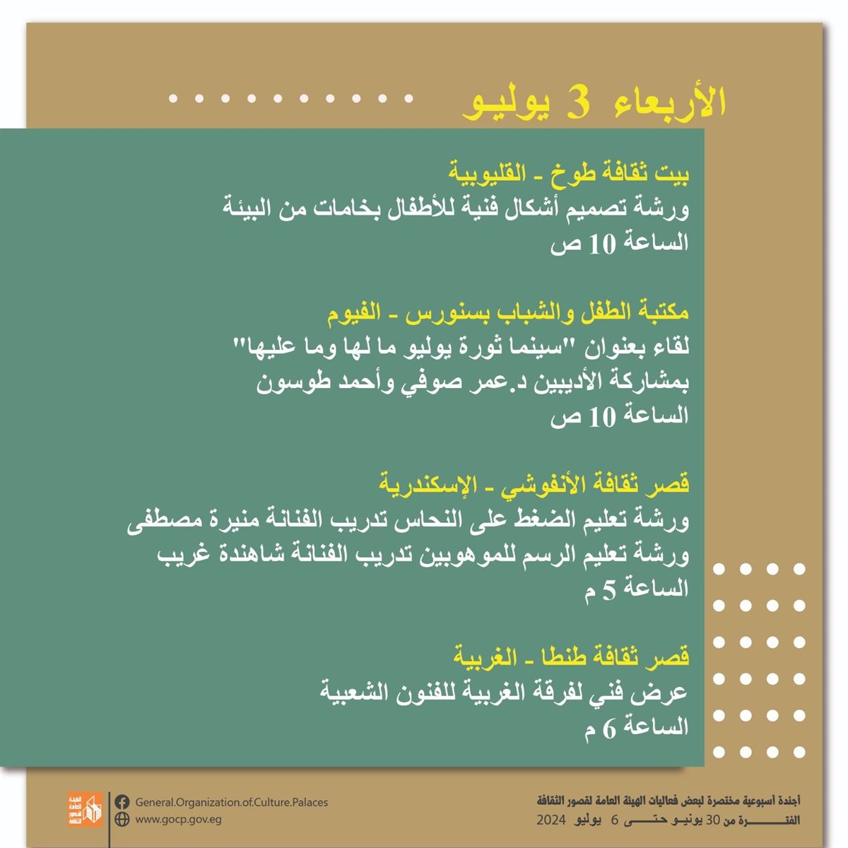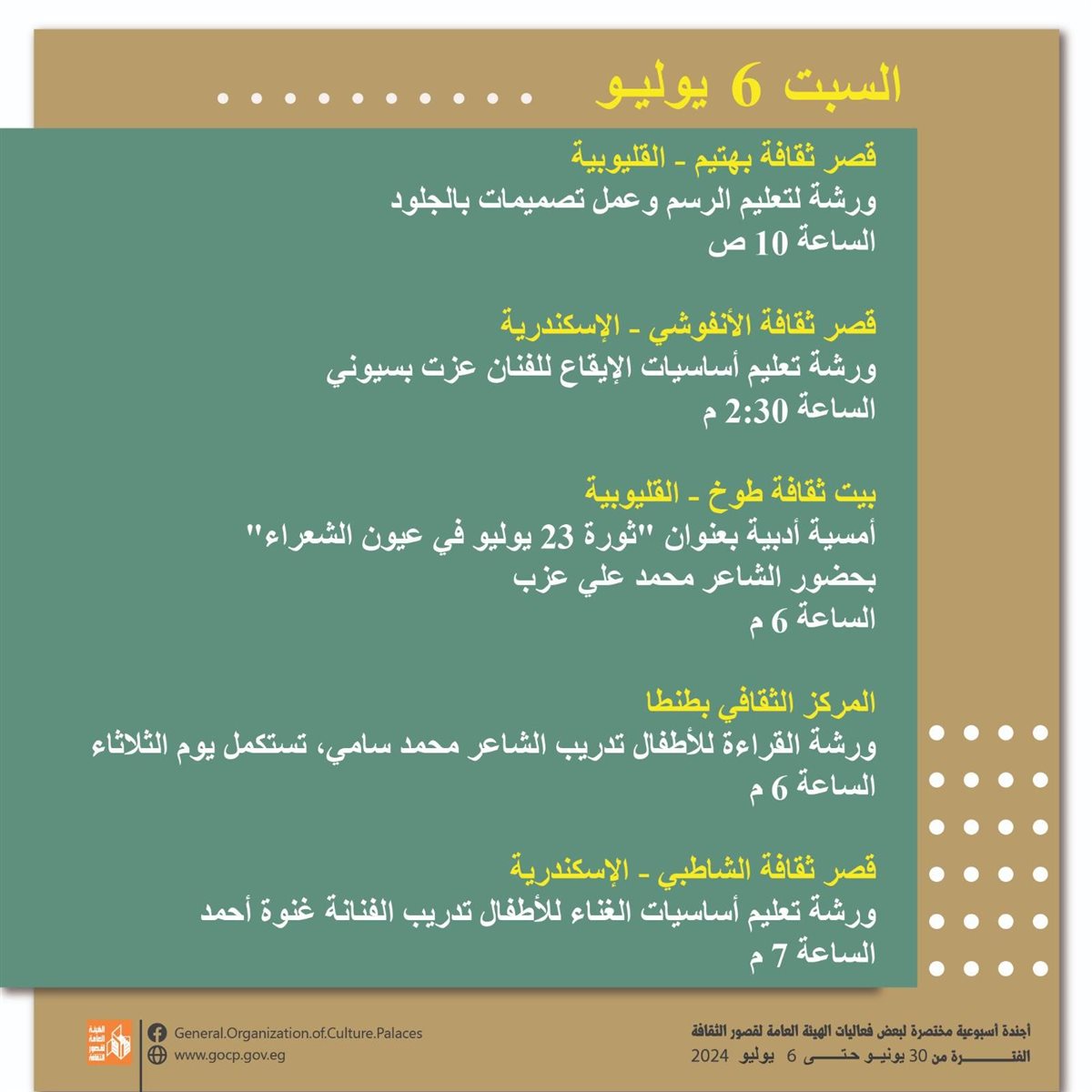 ضمن برامج وزارة الثقافة، وبرعاية الدكتورة نيفين الكيلاني وزيرة الثقافة، تقدم الهيئة العامة لقصور الثقافة برئاسة عمرو البسيوني، أجندة فعاليات ثقافية وفنية متنوعة بدءا من اليوم الأحد وحتى السبت المقبل 6 يوليو.