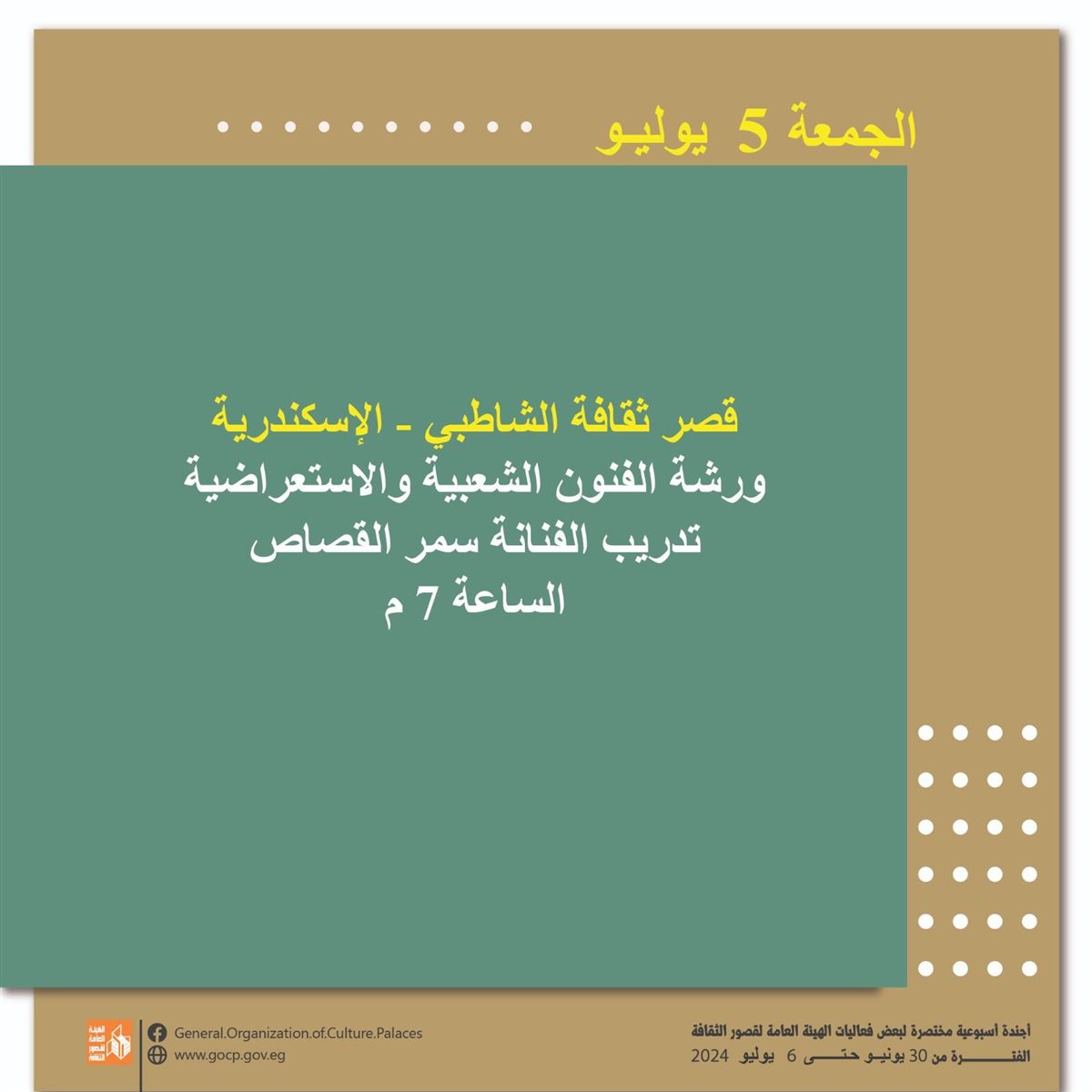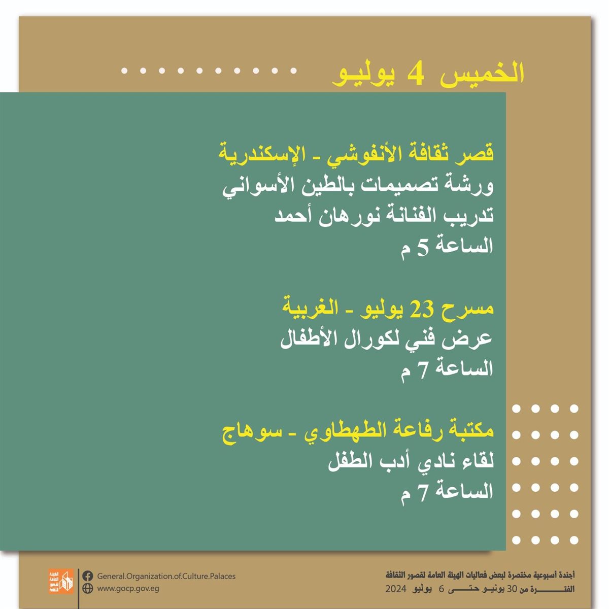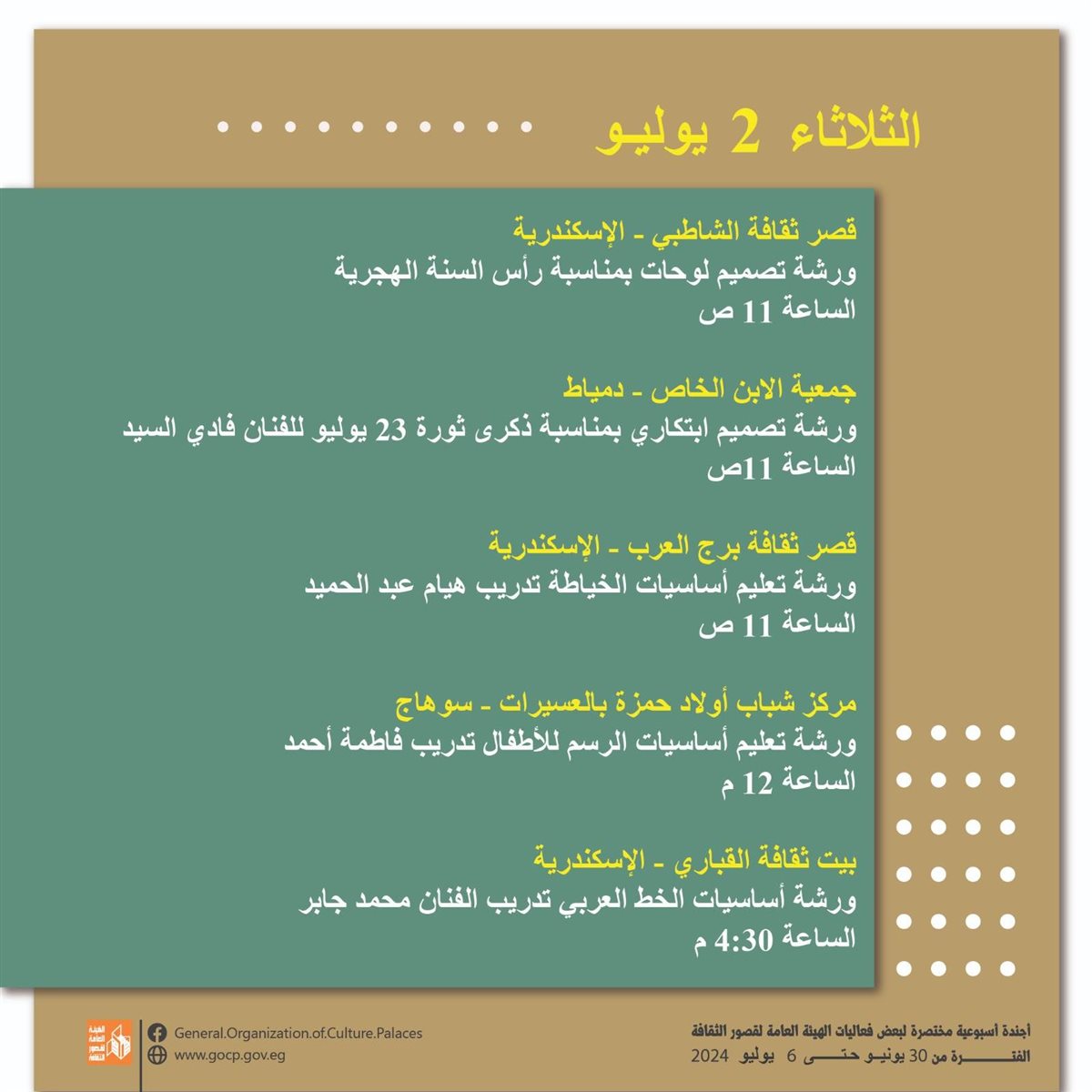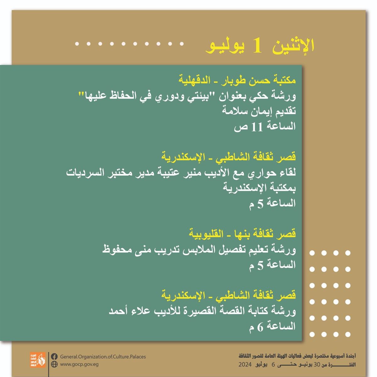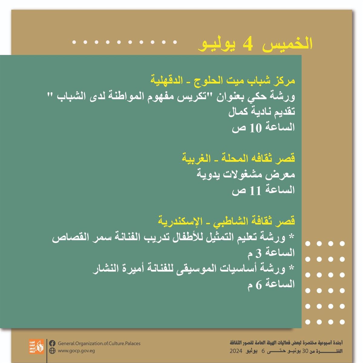 ضمن برامج وزارة الثقافة، وبرعاية الدكتورة نيفين الكيلاني وزيرة الثقافة، تقدم الهيئة العامة لقصور الثقافة برئاسة عمرو البسيوني، أجندة فعاليات ثقافية وفنية متنوعة بدءا من اليوم الأحد وحتى السبت المقبل 6 يوليو.