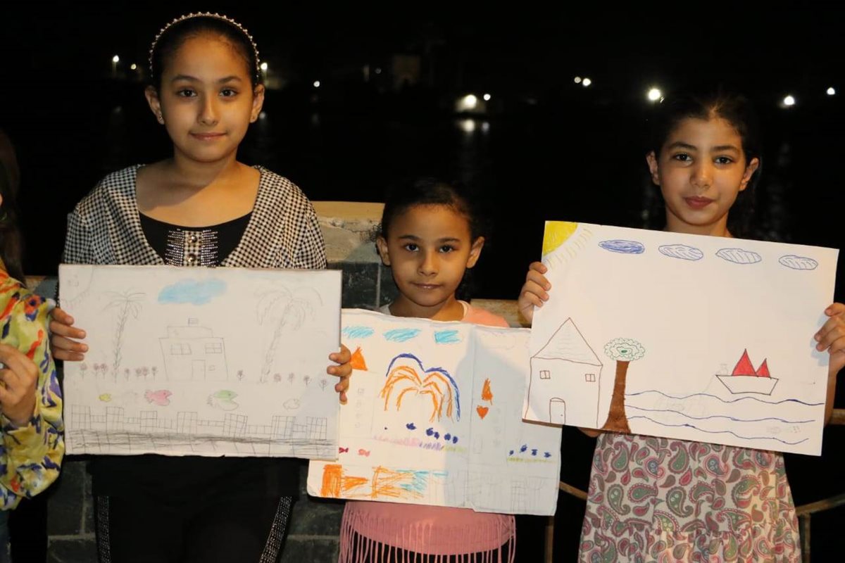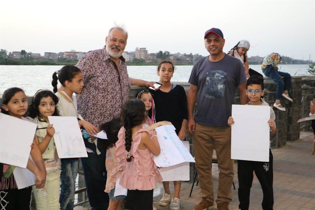 ومن أمام كورنيش النيل استكمل الموهوبون اللوحات الفنية ليقدموا برؤيتهم لوحات عن النهر وما حوله من عناصر كالبيوت المصرية، أبراج الحمام وأشجار النخيل وغيرها، للتأكيد على فكرة الطابع المصري.
