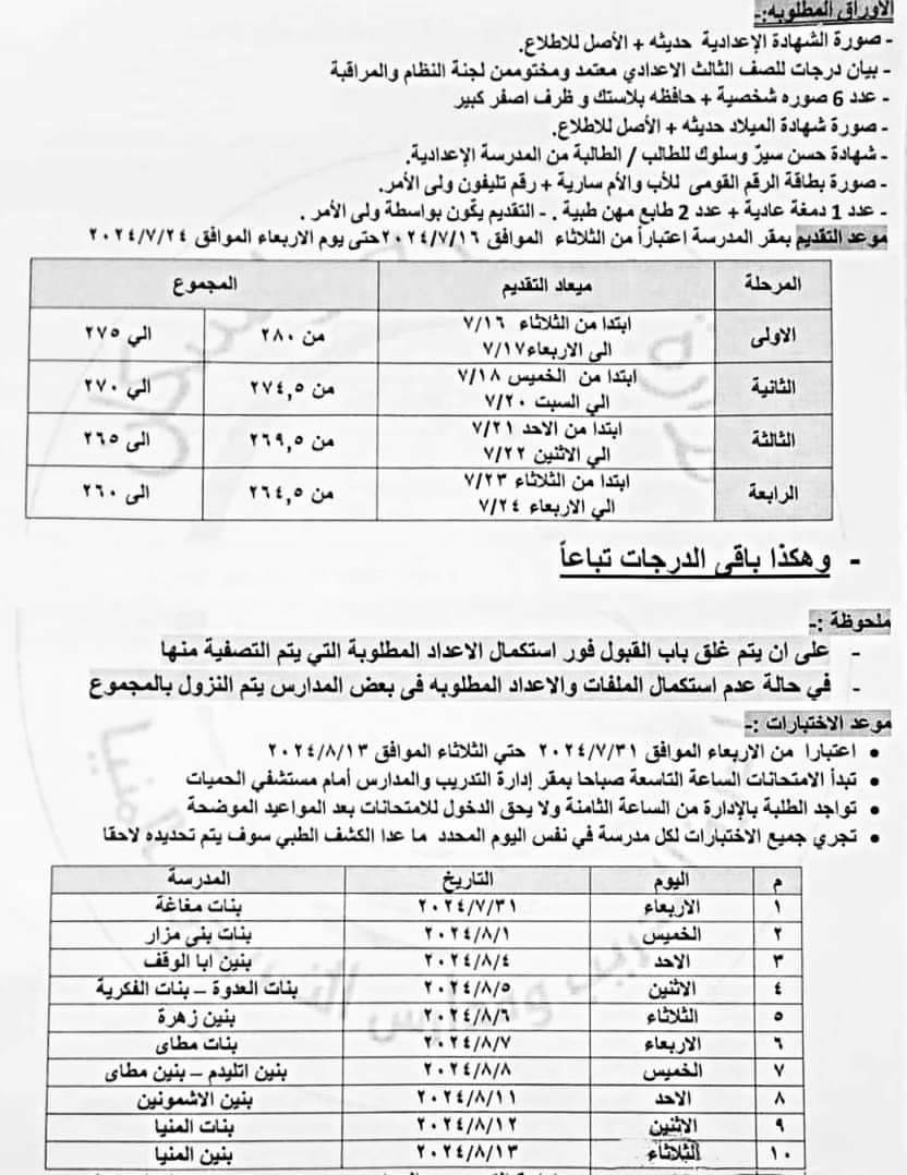 أعلن اللواء عماد كدواني محافظ المنيا، عن فتح باب القبول بمدارس الثانوية الفنية للتمريض، للعام الدراسي 2024/ 2025 بدءاً من بعد غد الثلاثاء 16/7/2024 وحتى الاربعاء 24/7/2024 ، فى 12 مدرسة (بنين - بنات) علي مستوي المحافظة.