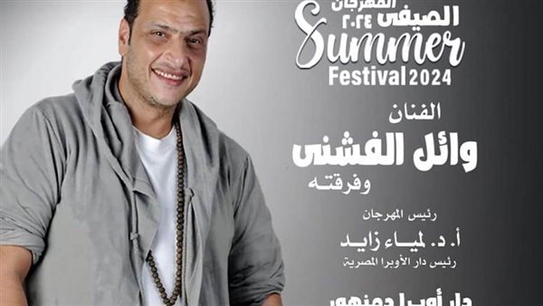تواصل دار الأوبرا المصرية برئاسة الدكتورة لمياء زايد برنامجها الصيفى بحفل للفنان وائل الفشنى وفرقته فى الثامنة والنصف مساء يوم الجمعة ١٩ يوليو على مسرح اوبرا دمنهور وذلك تحت رعاية الدكتور أحمد فؤاد هنو وزير الثقافة و الدكتورة جاكلين عازر محافظ البحيرة.